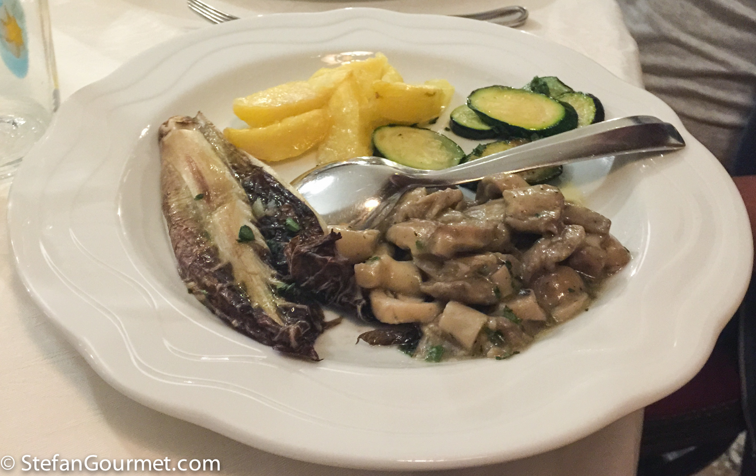 …accompanied by contorni: radicchio, potatoes, mushrooms, and zucchini. The meat was tender and together with the sauce had great depth of flavor. It is not easy to stew meat this well. 9/10