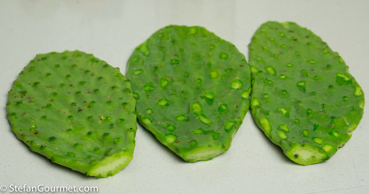 Next time try flaming the cactus pads. It will give them more flavor, and makes it easy to “brush off” the needles. See: https://www.youtube.com/watch?v=GVbsR2seejg Cheers.