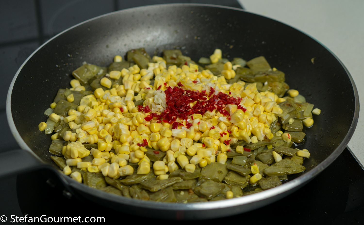 Add the corn, chilli, and garlic.
