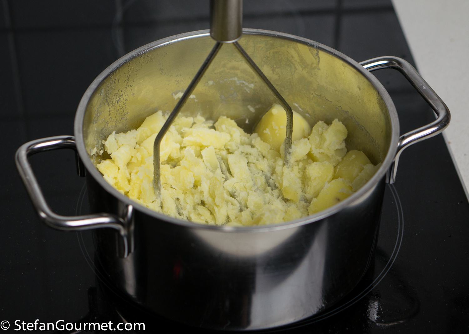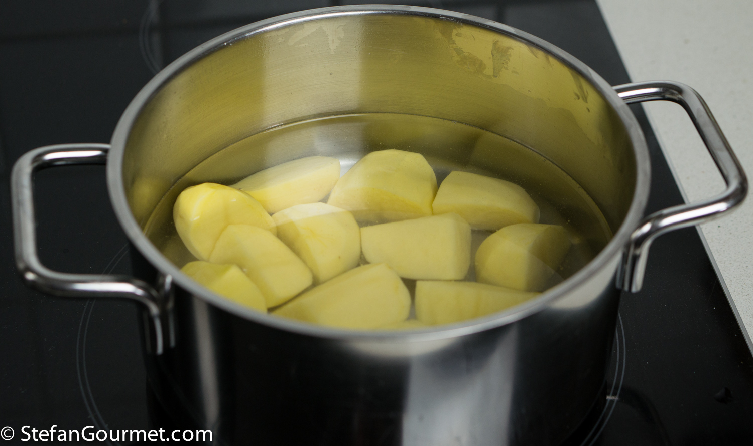 Peel the potatoes, cut them into chunks, and boil them in salted water until they are tender, about 20 minutes.