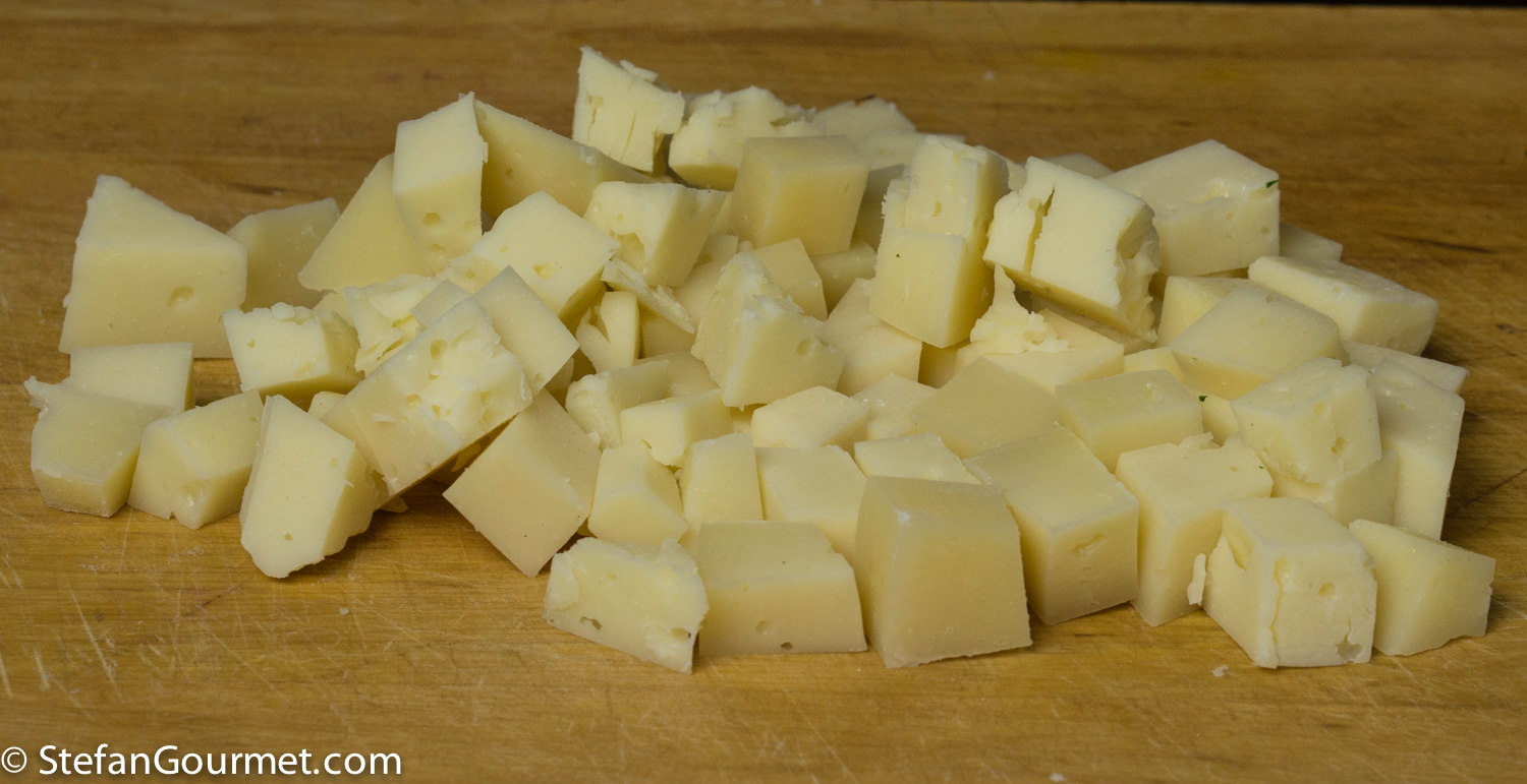 Meanwhile, remove the crust from the Montasio and cut it into chunks of about 1 cm (1/2 inch).
