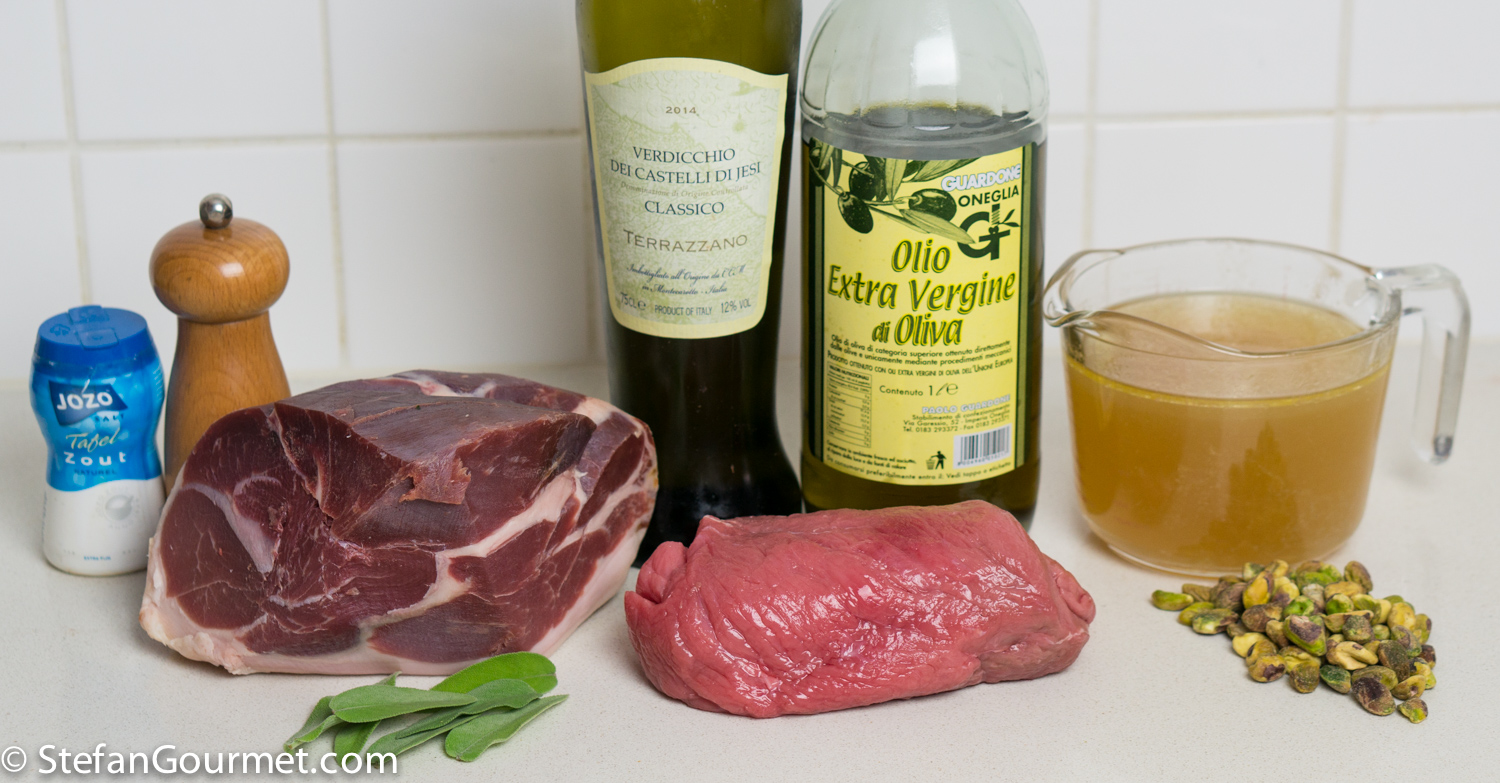 The combination of veal, prosciutto and sage is well-known from Saltimbocca. The addition of toasted pistachios adds an interesting element in terms of both texture and flavor. Here’s what I did…