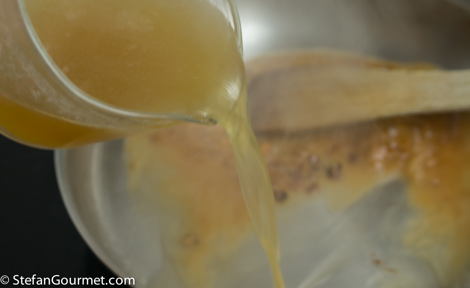 Discard most of the olive from the pan, the deglaze the pan with 80 ml (1/3 cup) dry white wine. Use a wooden spatula to stir and pick up the browned bits and pieces that are stuck to the pan.