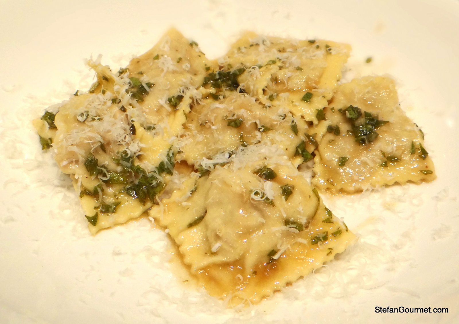 Serve at once on preheated plates. You could sprinkle them with some freshly grated parmigiano, but that is not really necessary. Remind your guests to eat each ravioli in a single bite.