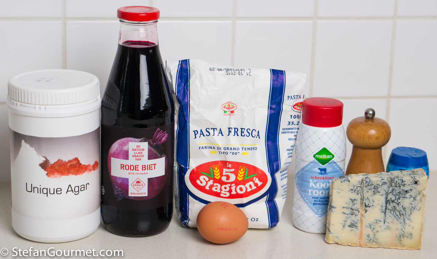 This dish has been inspired by a dish we had at Le Calandre in Italy. The concept is very easy: beetroot juice is turned into jelly using agar, ravioli are filled with the beetroot jelly, and when the ravioli are cooked the beetroot turns liquid again. So when you bite into the ravioli, beetroot juice will flow in your mouth. The contrast between the creamy salty pungent gorgonzola sauce and the earthy sweet fresh beetroot that bursts into your mouth is very nice. These ravioli make use of the property of agar that it sets below 35C/95F and becomes liquid again when heated to 85C/185F.