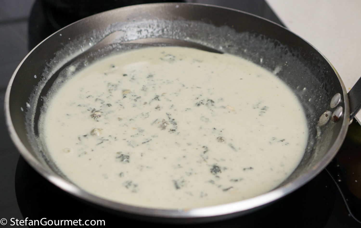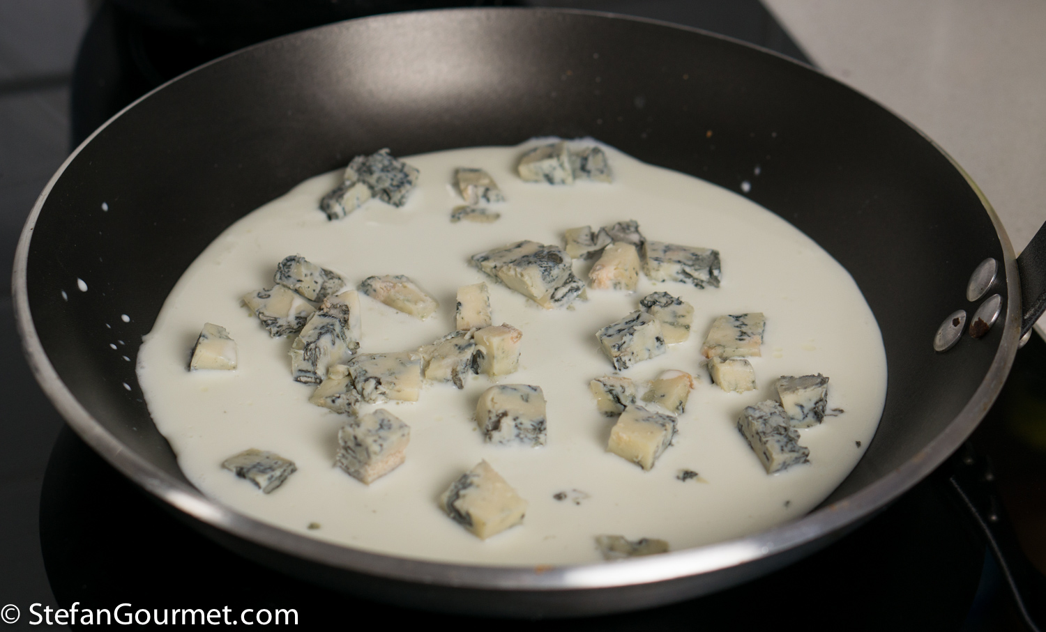 Bring a large pot of water to a boil. Make the sauce while you wait for the water to boil. Put 125 ml (1/2 cup) of cream in a non-stick pan over low heat. Add 100 grams (3.5 oz) of crumbled or diced gorgonzola.
