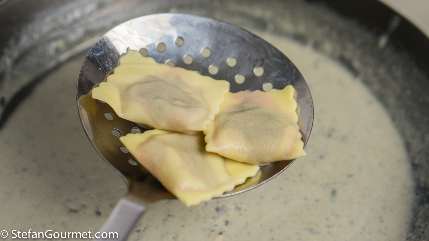 When the water boils, add salt and the ravioli. Cook them for about 2 minutes, then lift them out with a strainer and carefully add them to the gorgonzola sauce. Check carefully for ravioli that are leaking and discard them.