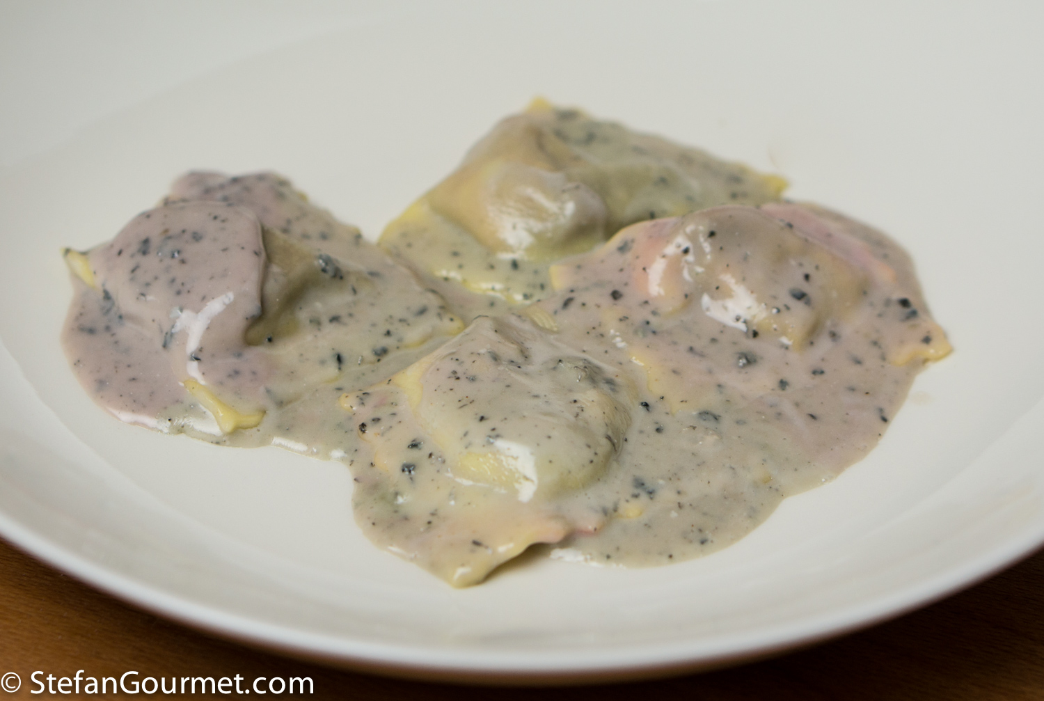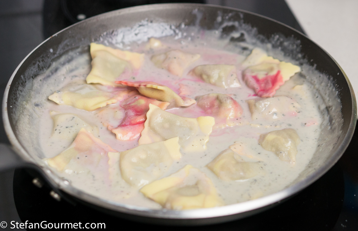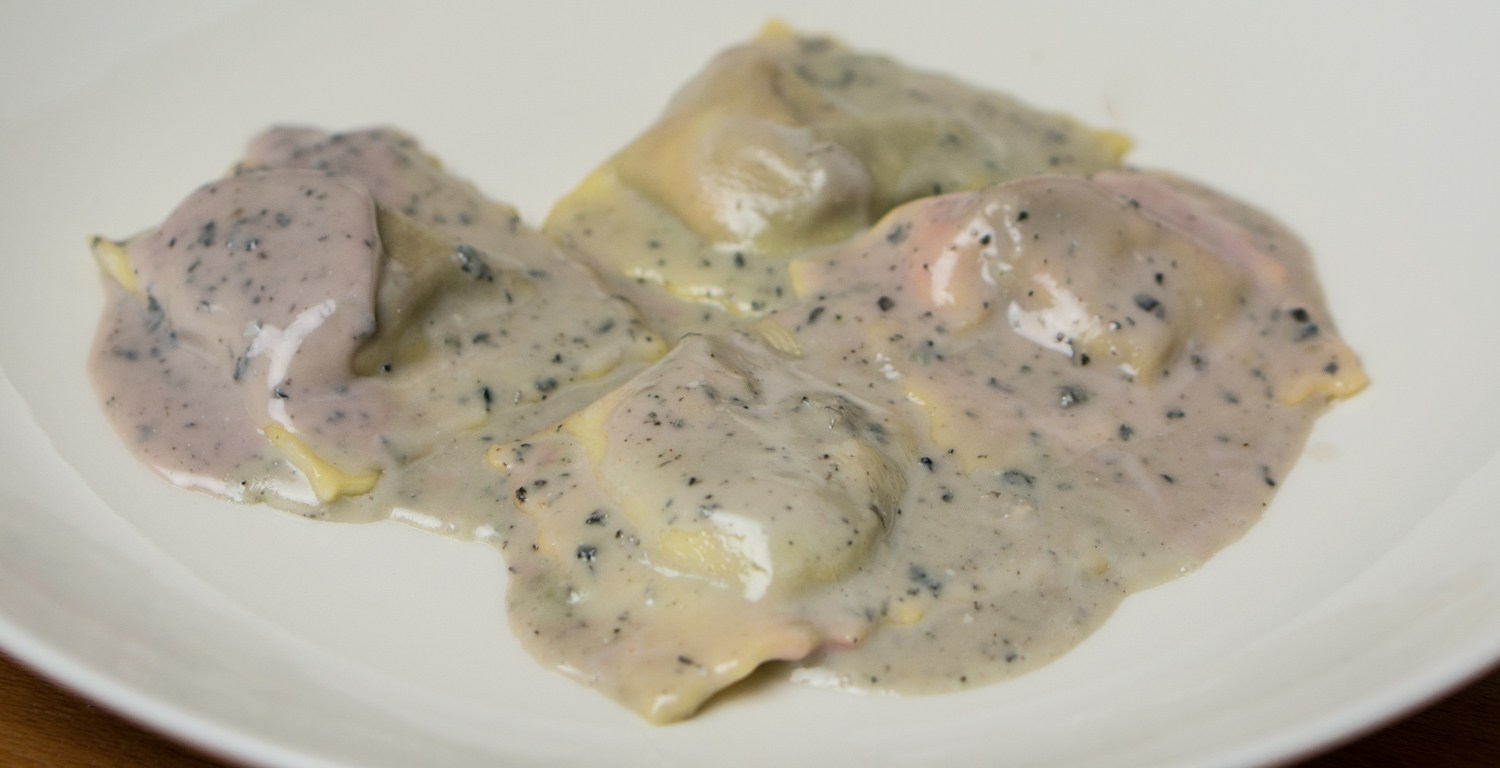 The dish is quite simple with only a few ingredients, the hard part is the execution. Ravioli are best when the dough is rolled out as thinly as possible. This however increases the risk of small tears and punctures. With many ravioli fillings a small puncture in the dough is okay, but with this filling it will mean that the beetroot juice will leak into the gorgonzola sauce. Which is what happened with a few of the ravioli that I had made. If your execution is perfect, the sauce is not supposed to have the purplish discoloration you can see in the photo.