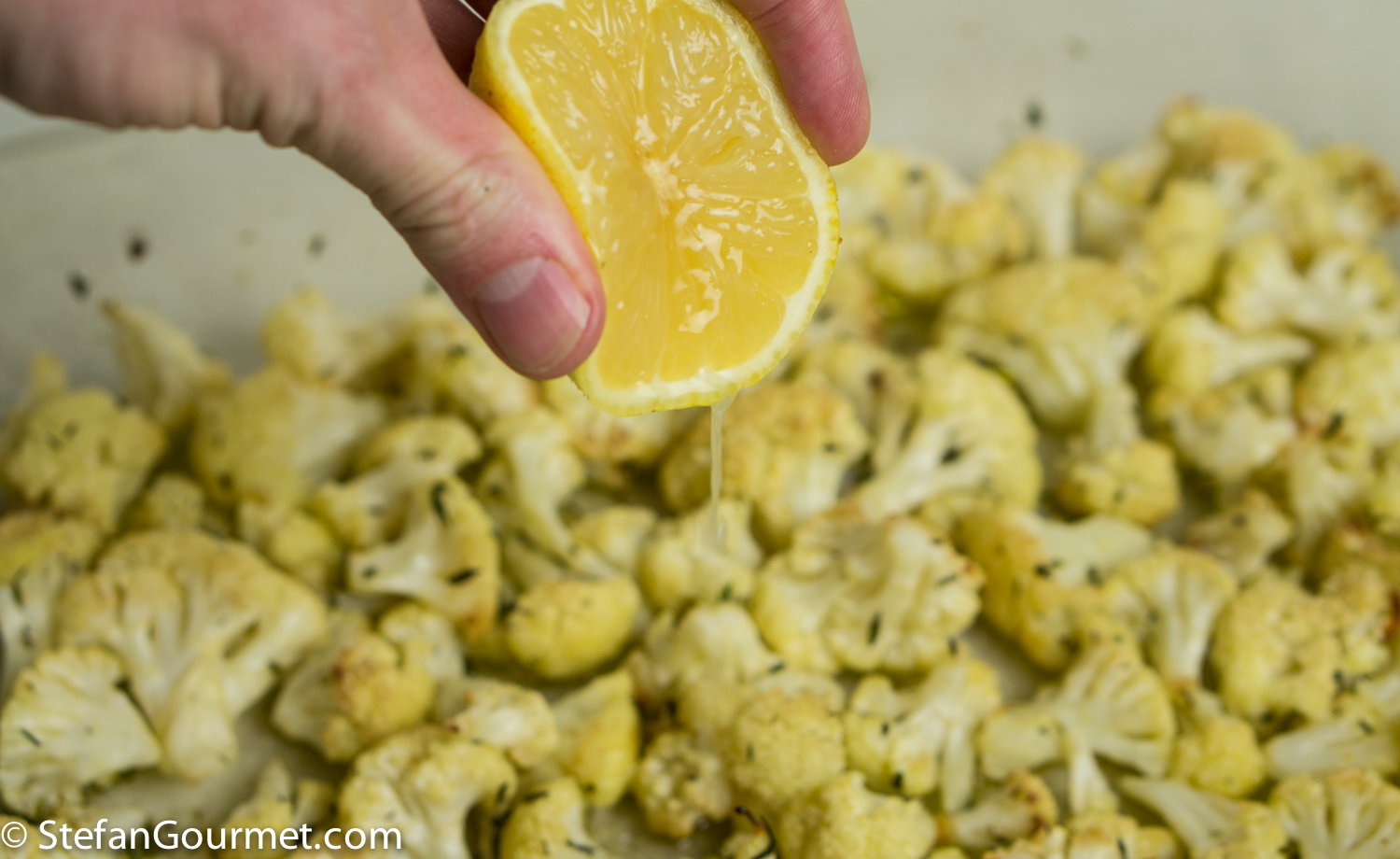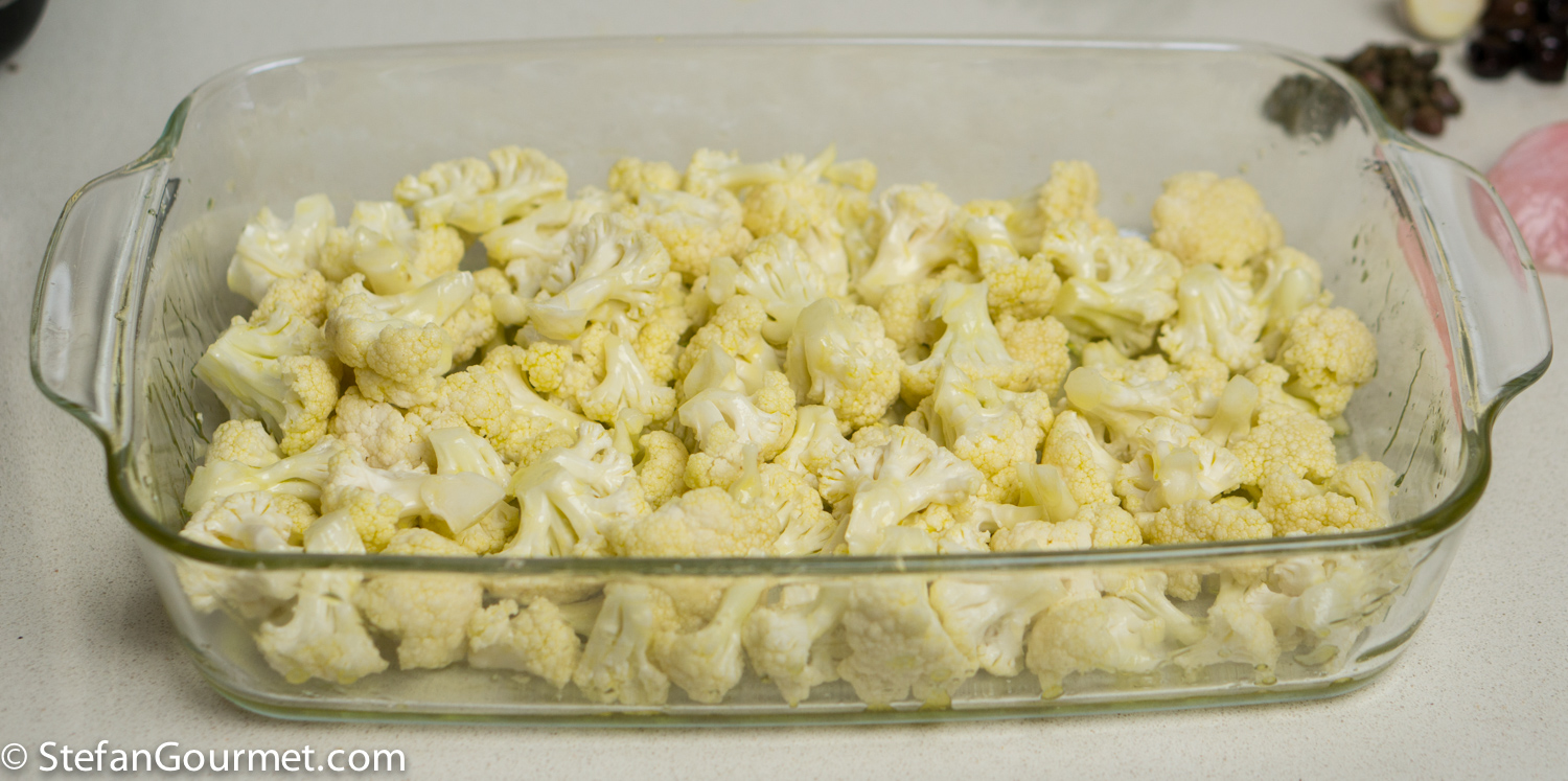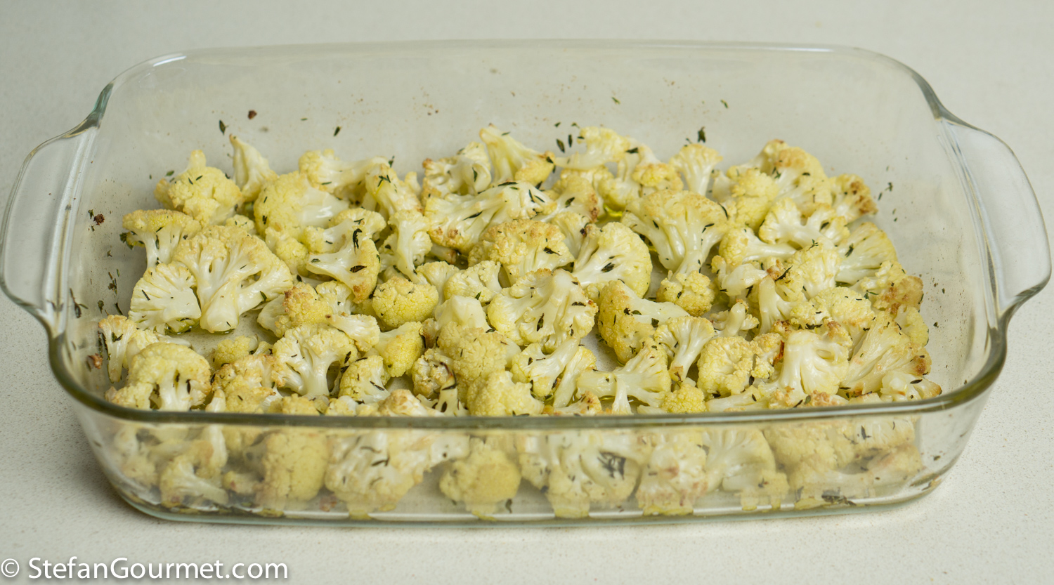 Preheat the oven to 180C/350F. Put 400 grams (.9 lb) cauliflower florets in an oven-proof dish. Drizzle with extra virgin olive oil, and toss to mix. Roast in the oven for about half an hour.