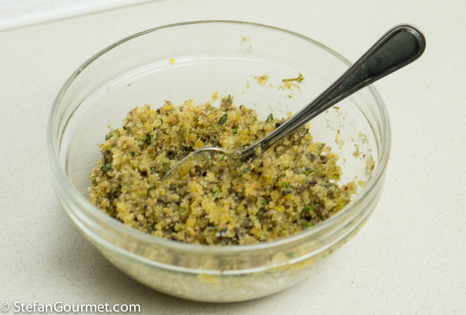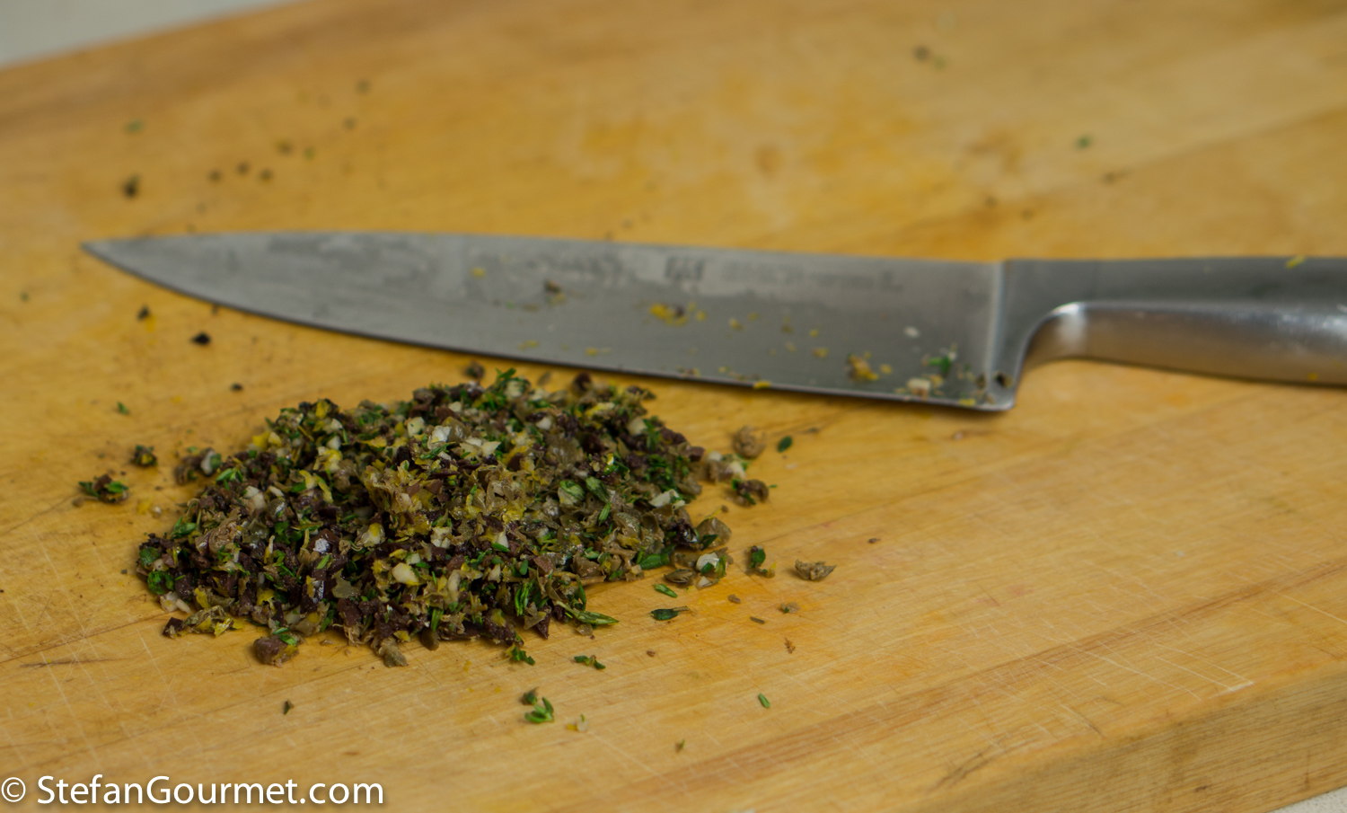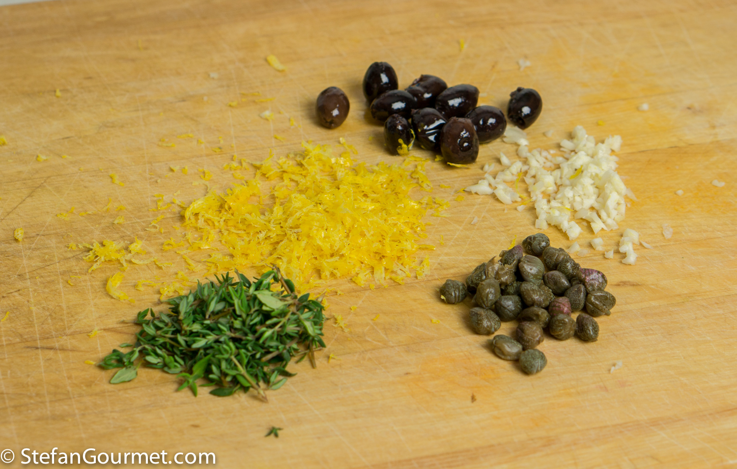 Zest the lemon and combine the lemon zest with a tablespoon of fresh thyme leaves, a tablespoon of olives, a tablespoon of rinsed and dried capers, and a minced garlic clove.