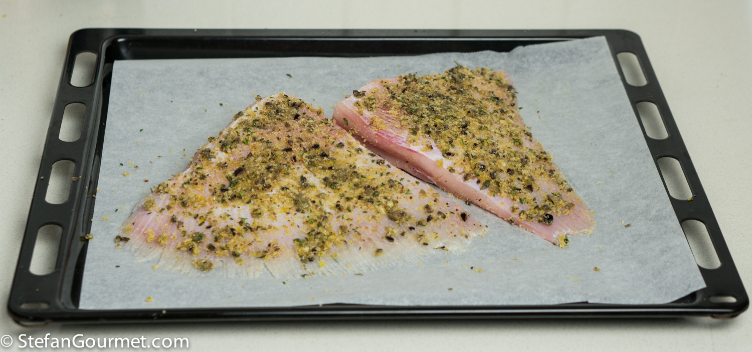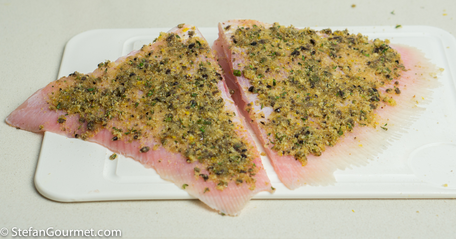 Press the breadcrumb mixture in an even layer on both sides of the skate.