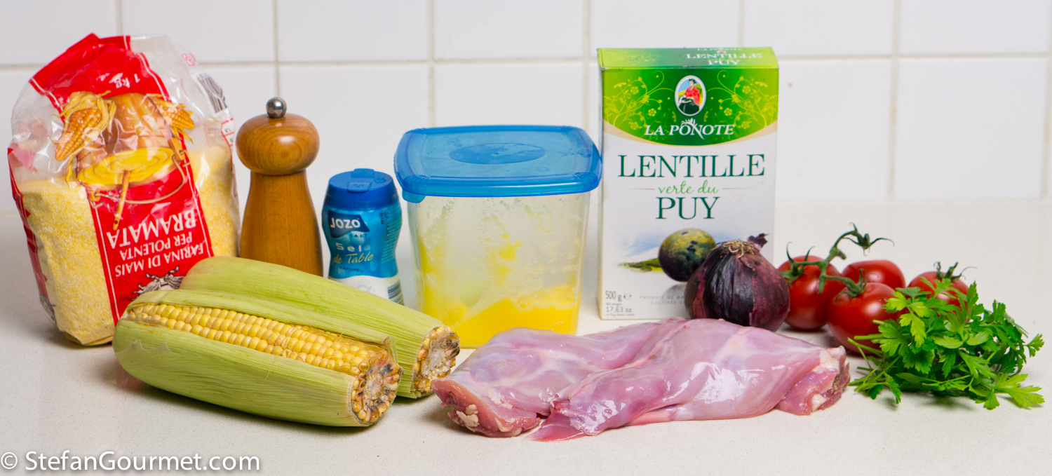 This is an original dish that I created based on what I had in my fridge and pantry. Succulent morsels of rabbit with a crispy crust are served atop a flavorful and healthy lentil and corn salad with tomatoes and red onions. For the crust on the rabbit I used cornmeal to echo the corn in the salad. The rabbit is served hot, the lentil salad at room temperature. It makes for a nice contrast between flavors, temperatures and textures. And it is low in fat and high in protein and fibers. But most importantly, it is delicious.To serve rabbit this way, a sous-vide is a great help to get it tender and keep it juicy. You could substitute the rabbit with chicken, which is easier to obtain and easier to cook. But not as delicious. Here’s what I did…