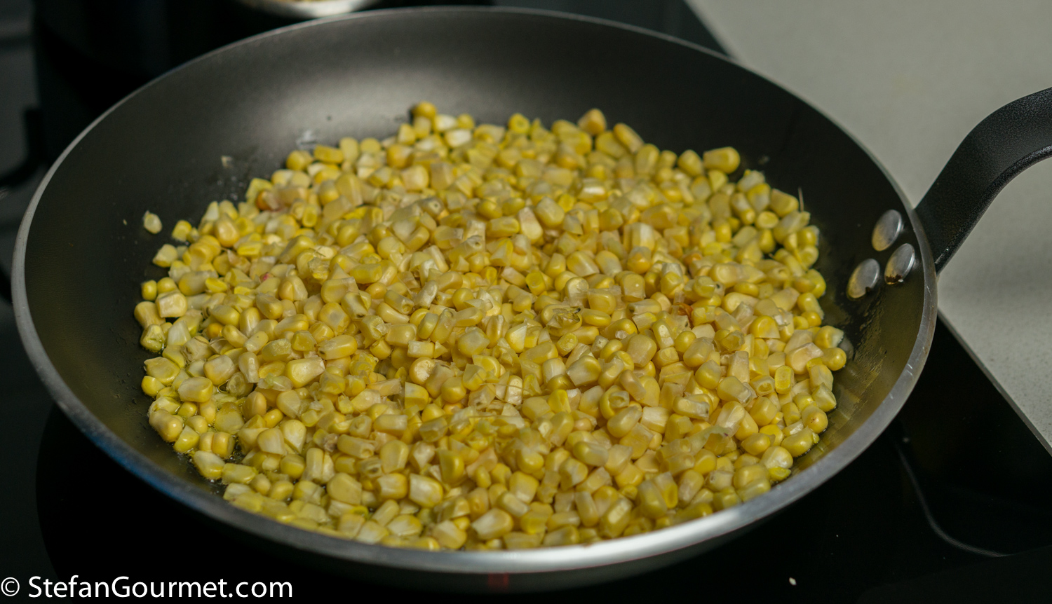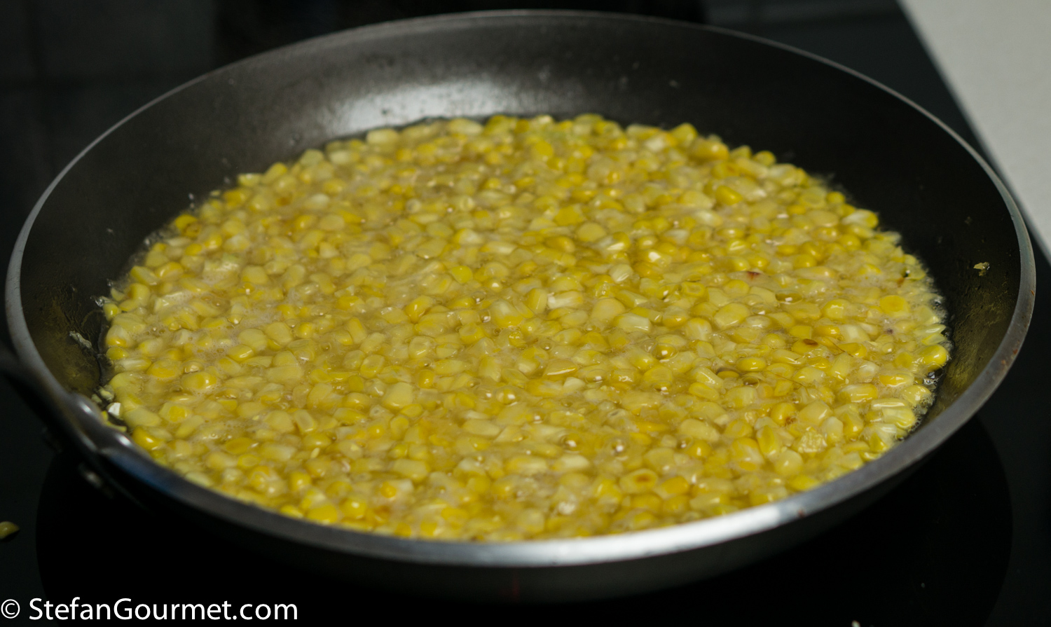 Meanwhile, shave the corn kernels off 2 cobs. Melt a tablespoon of (clarified) butter in a frying pan and add the corn kernels. Stir over high heat for a couple of minutes, until the corn is coated with the butter.