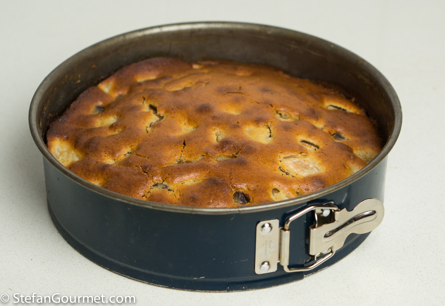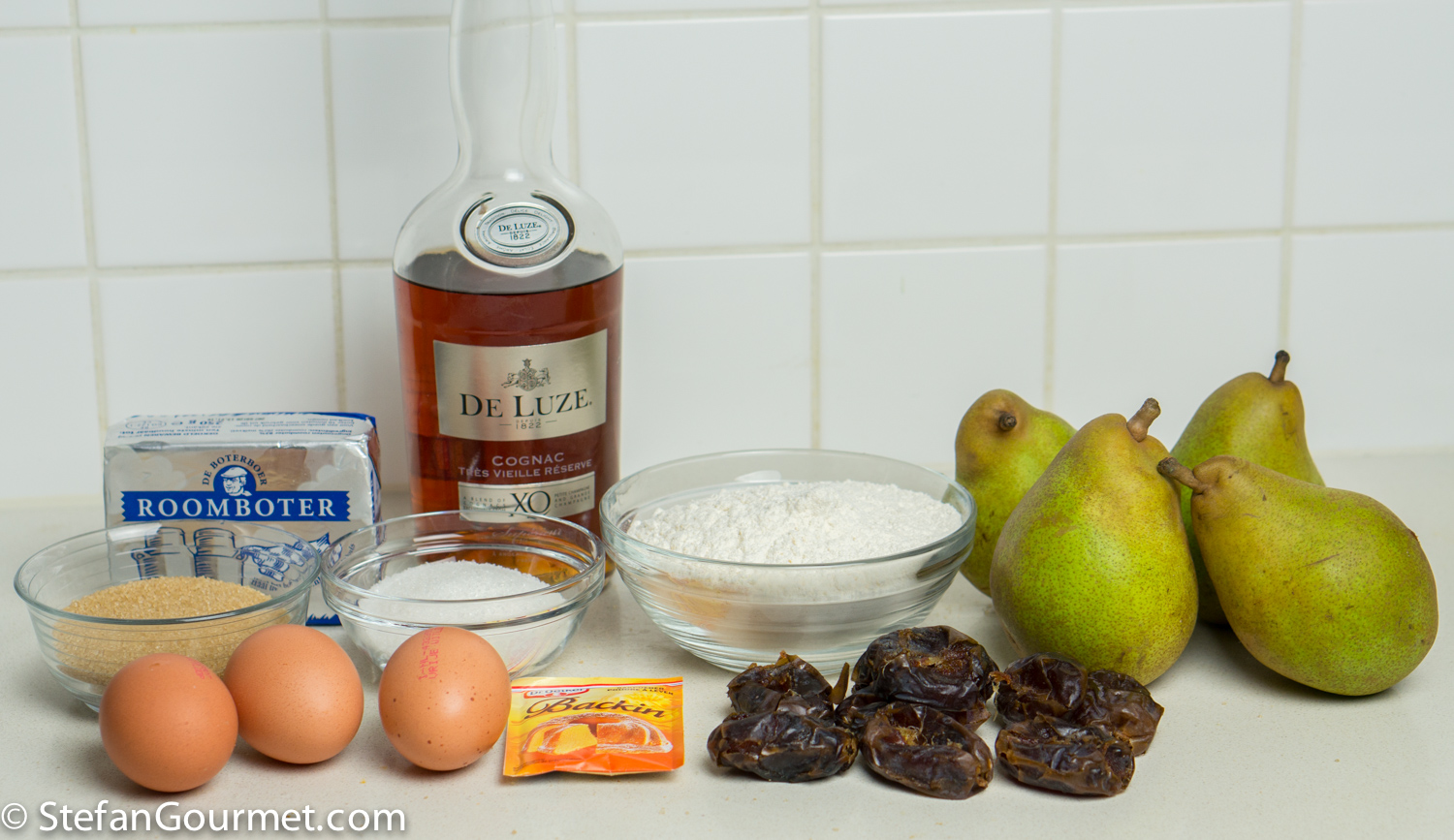 The pears go on top as well as in the cake, together with the dates. The cake tin is lined with caramel for some additional flavor. That is the only tricky part of the recipe, as caramels are always difficult to work with.