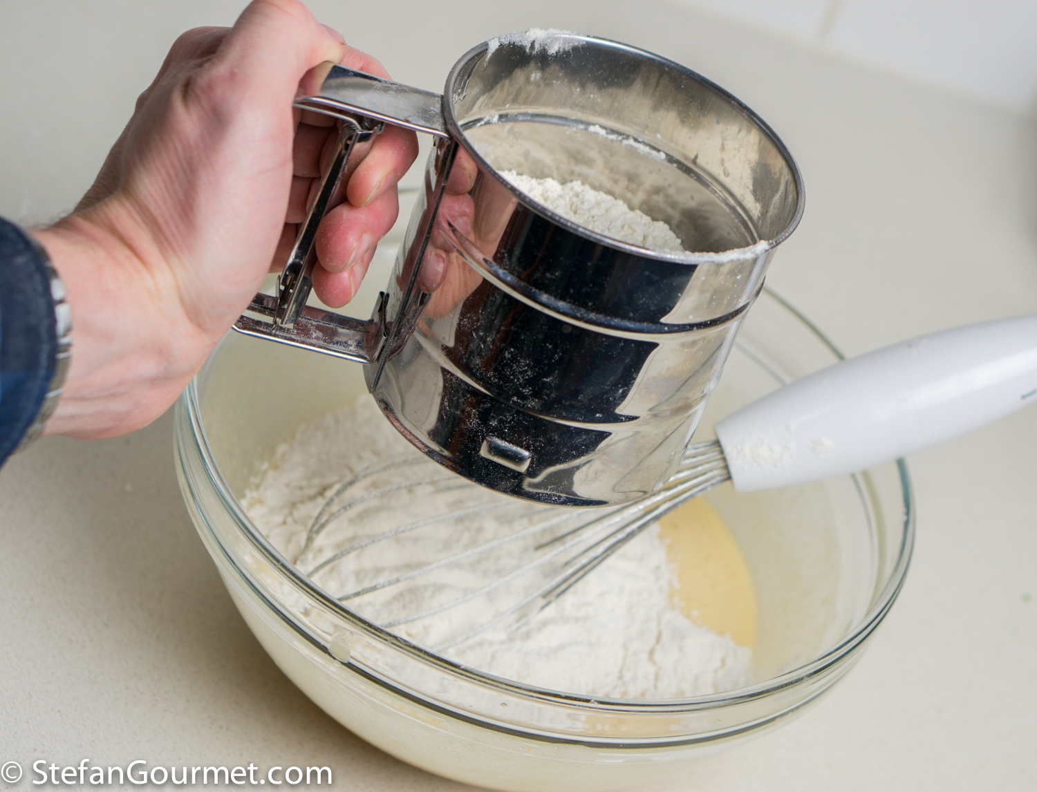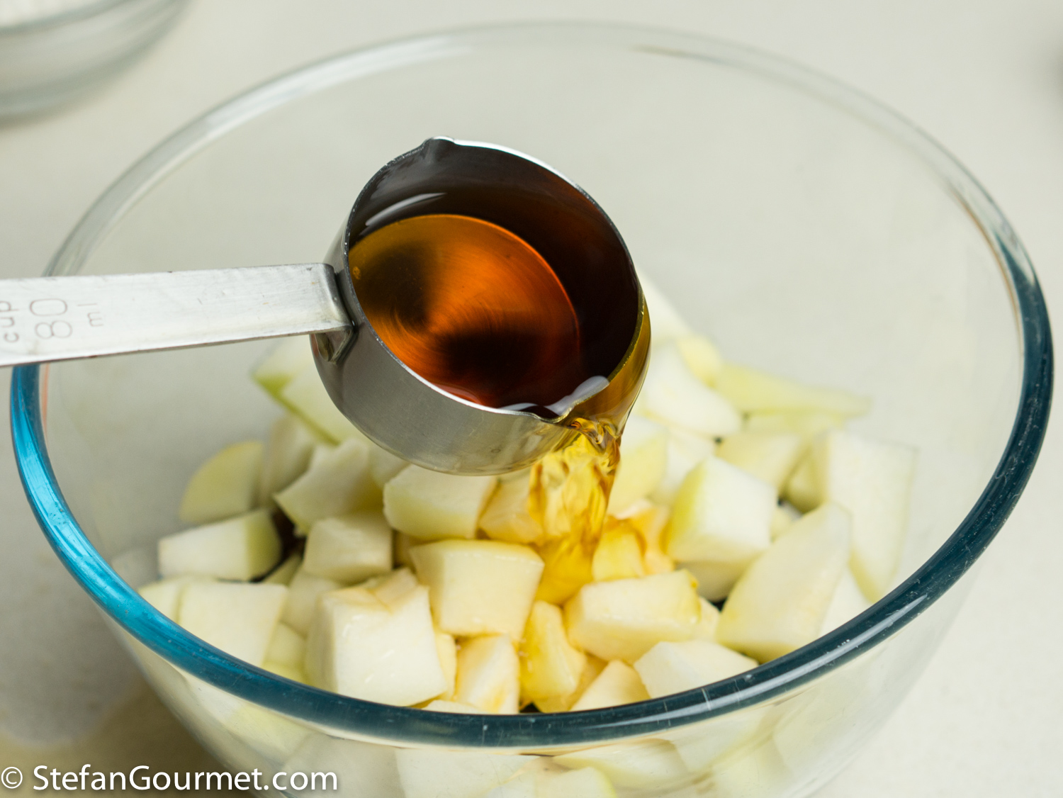 After the fruit has macerated for at least half an hour, add it to the batter, including all the liquid from the bowl.