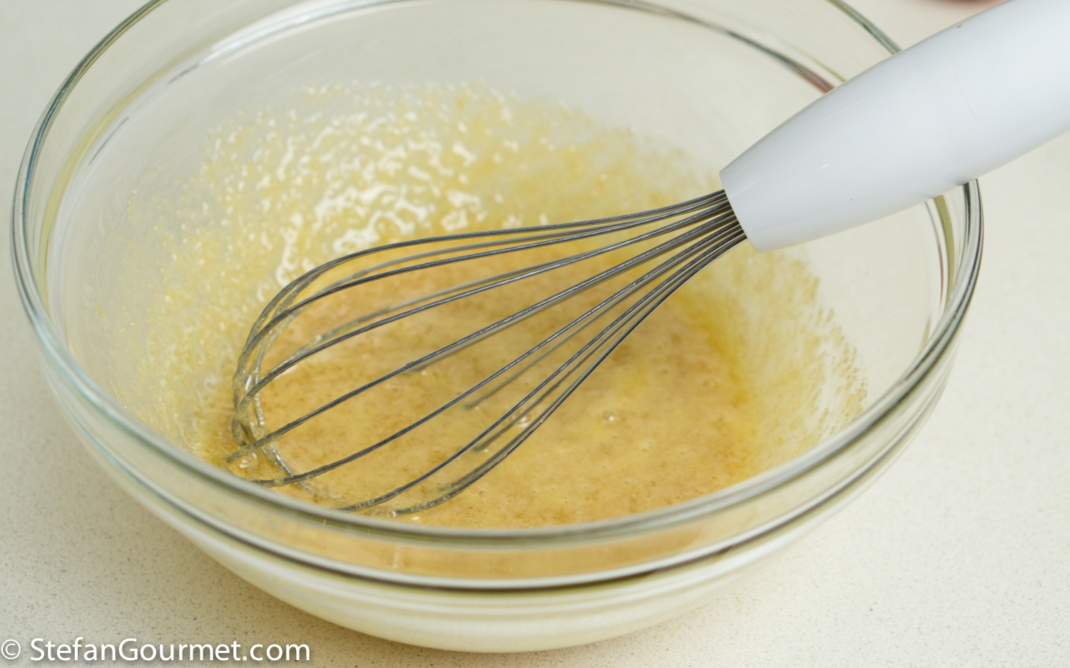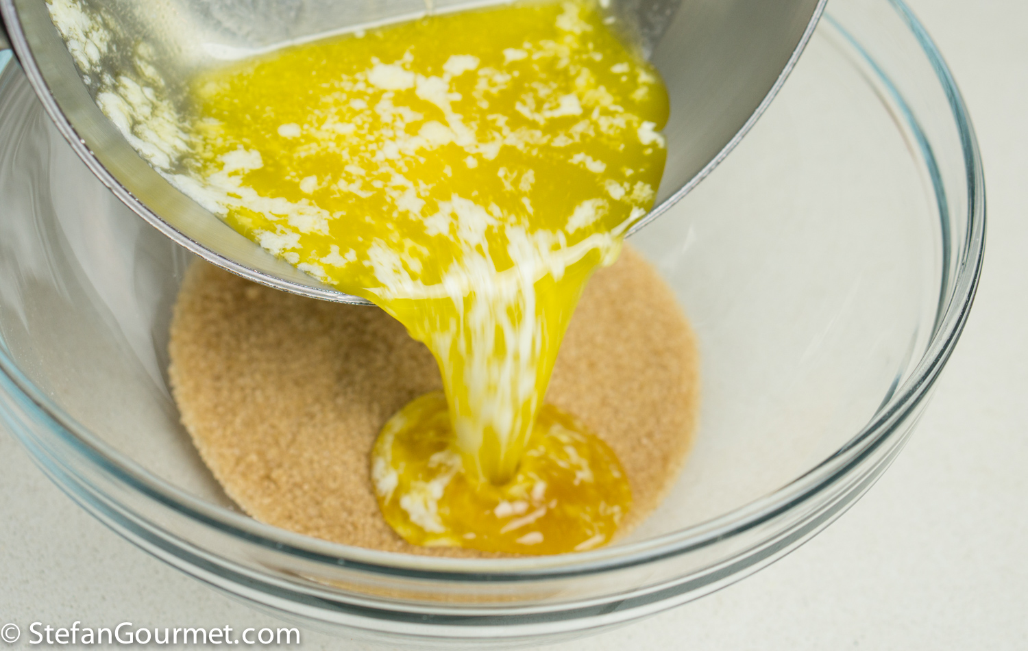 Combine 100 grams of melted butter with 100 grams of cane sugar in a bowl.