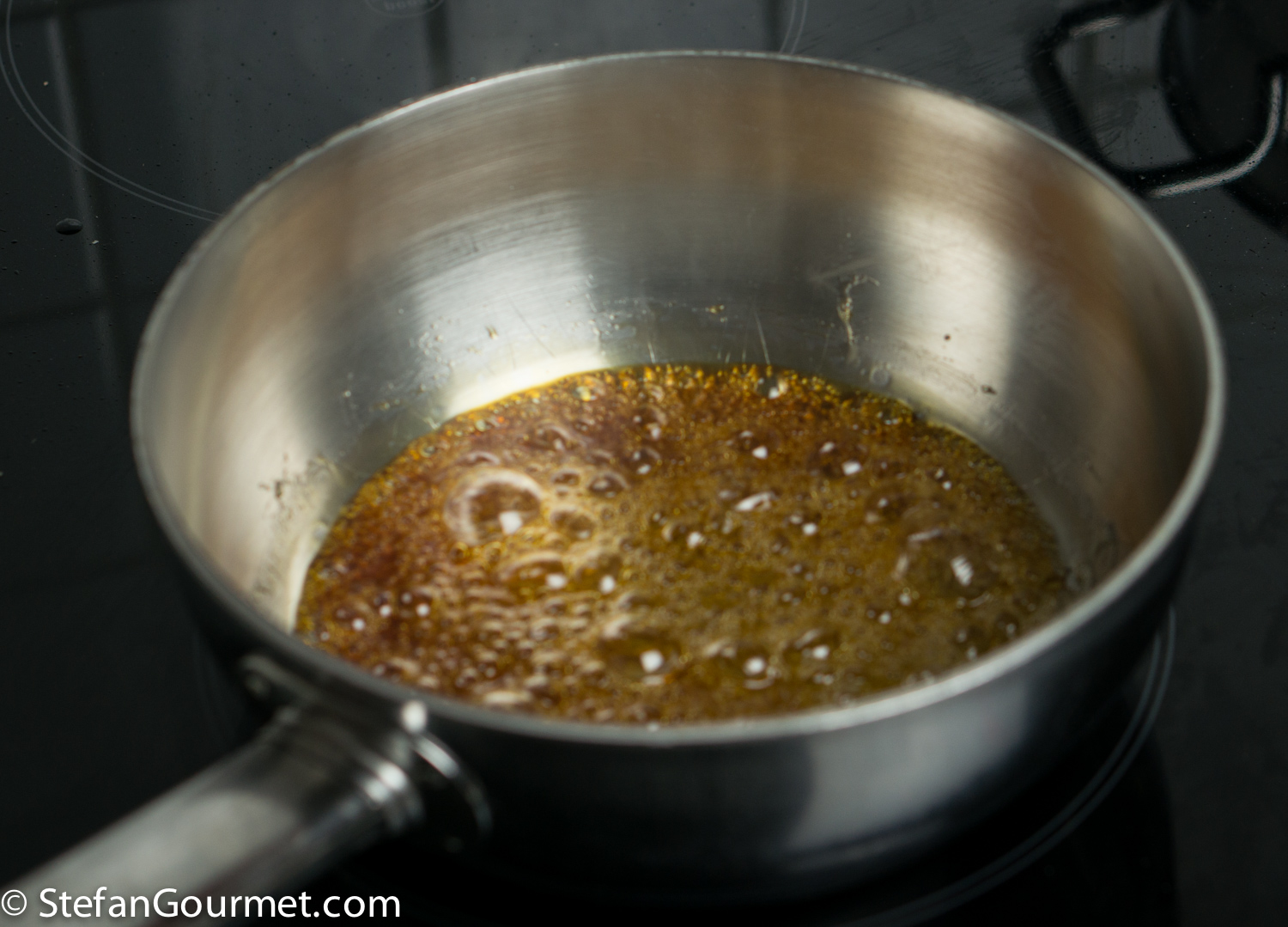 Once the caramel starts to change color, you have to work quickly. Get the preheated pan out of the oven.
