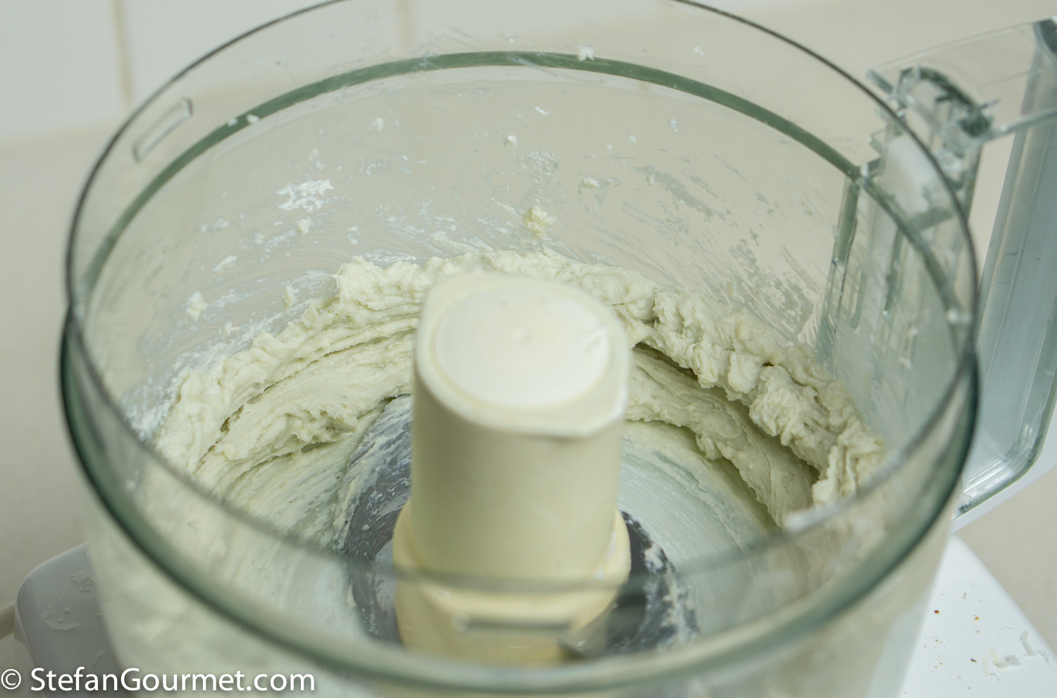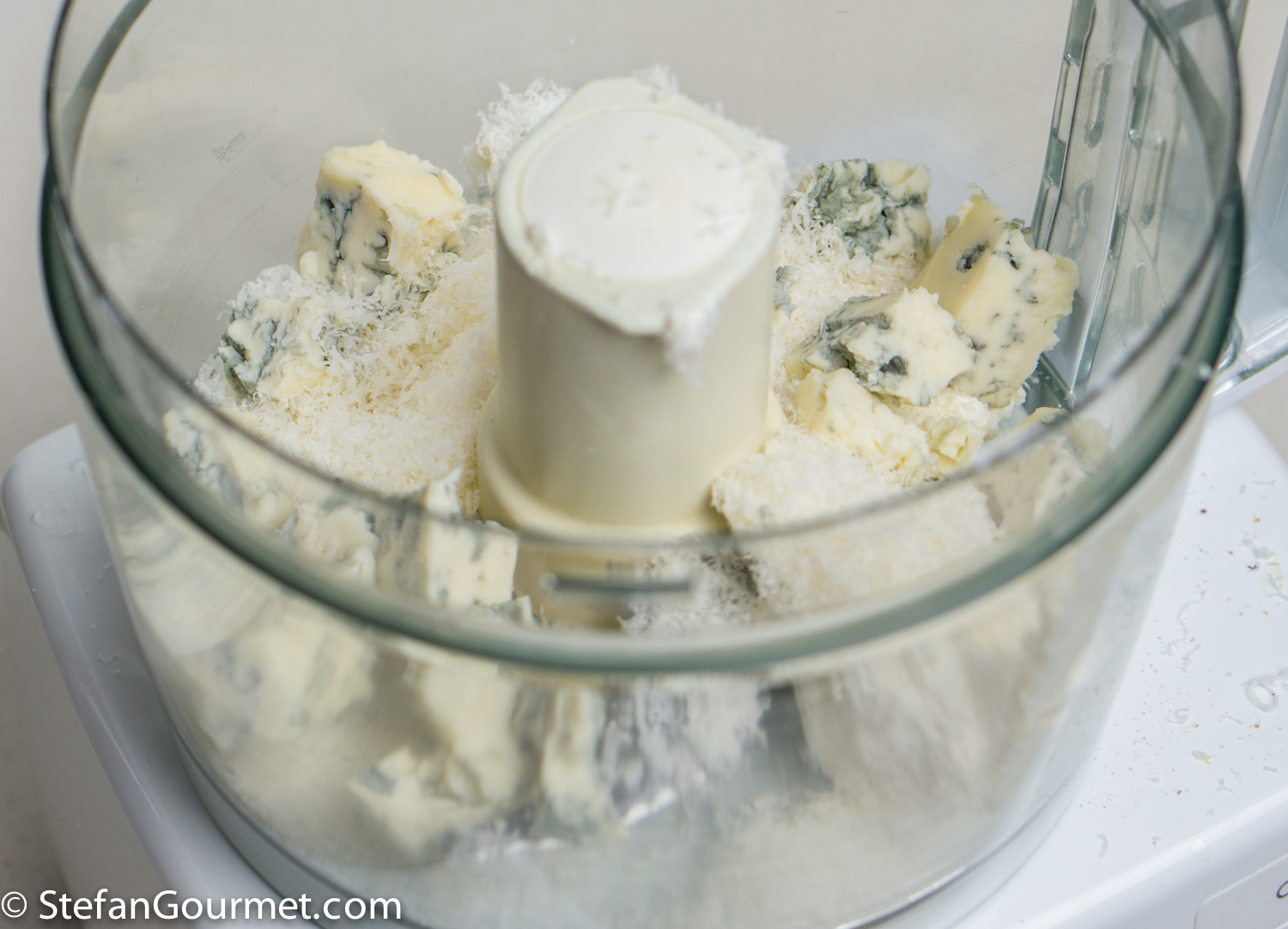 Combine 100 grams gorgonzola, 50 grams of ricotta and 30 grams of parmigiano in the bowl of the food processor.