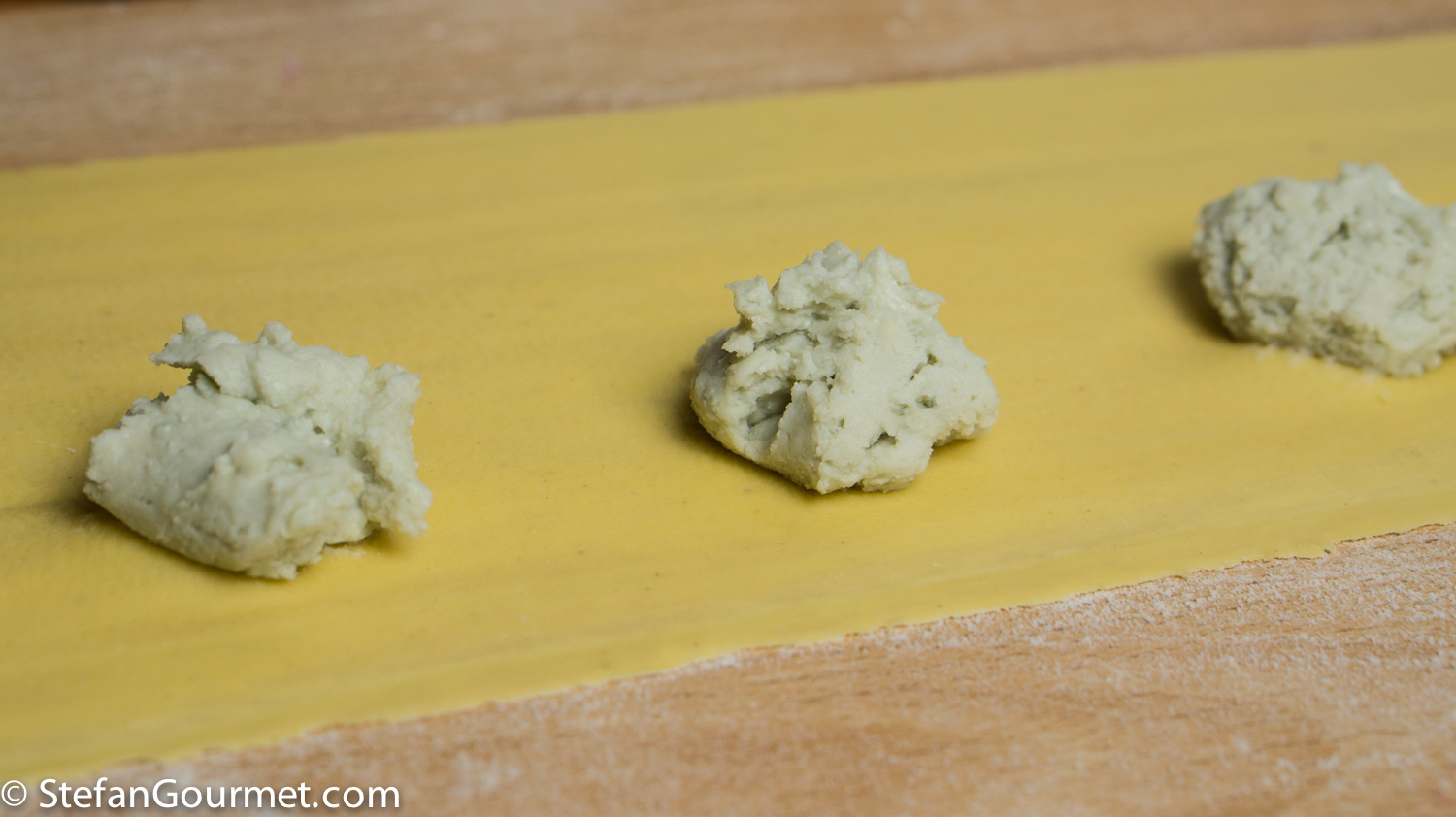 Roll out the dough and make ravioli with the gorgonzola stuffing.