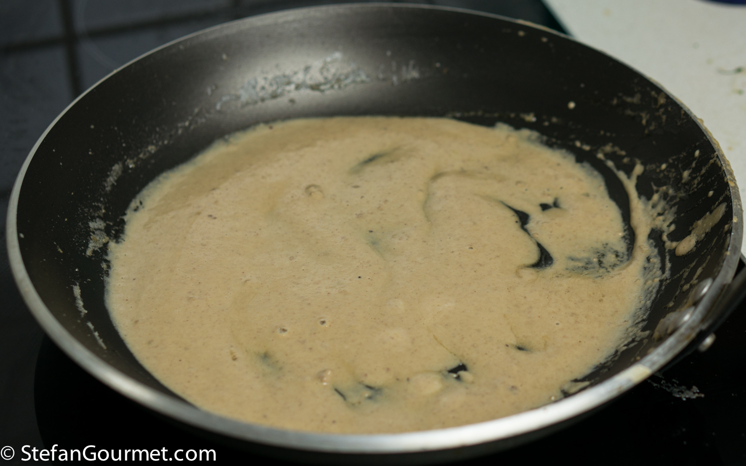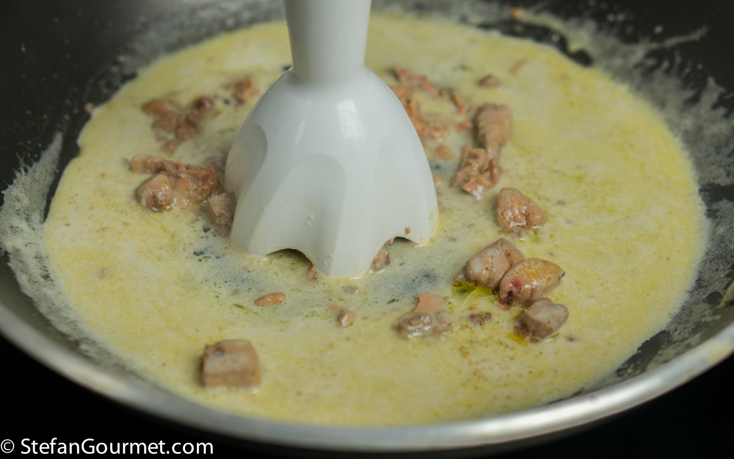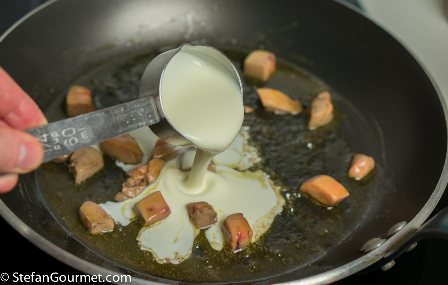 When the cognac has evaporated, add 120 ml (1/2 cup) of cream. Stir over medium heat until the cream is hot, but do not allow the cream to boil.