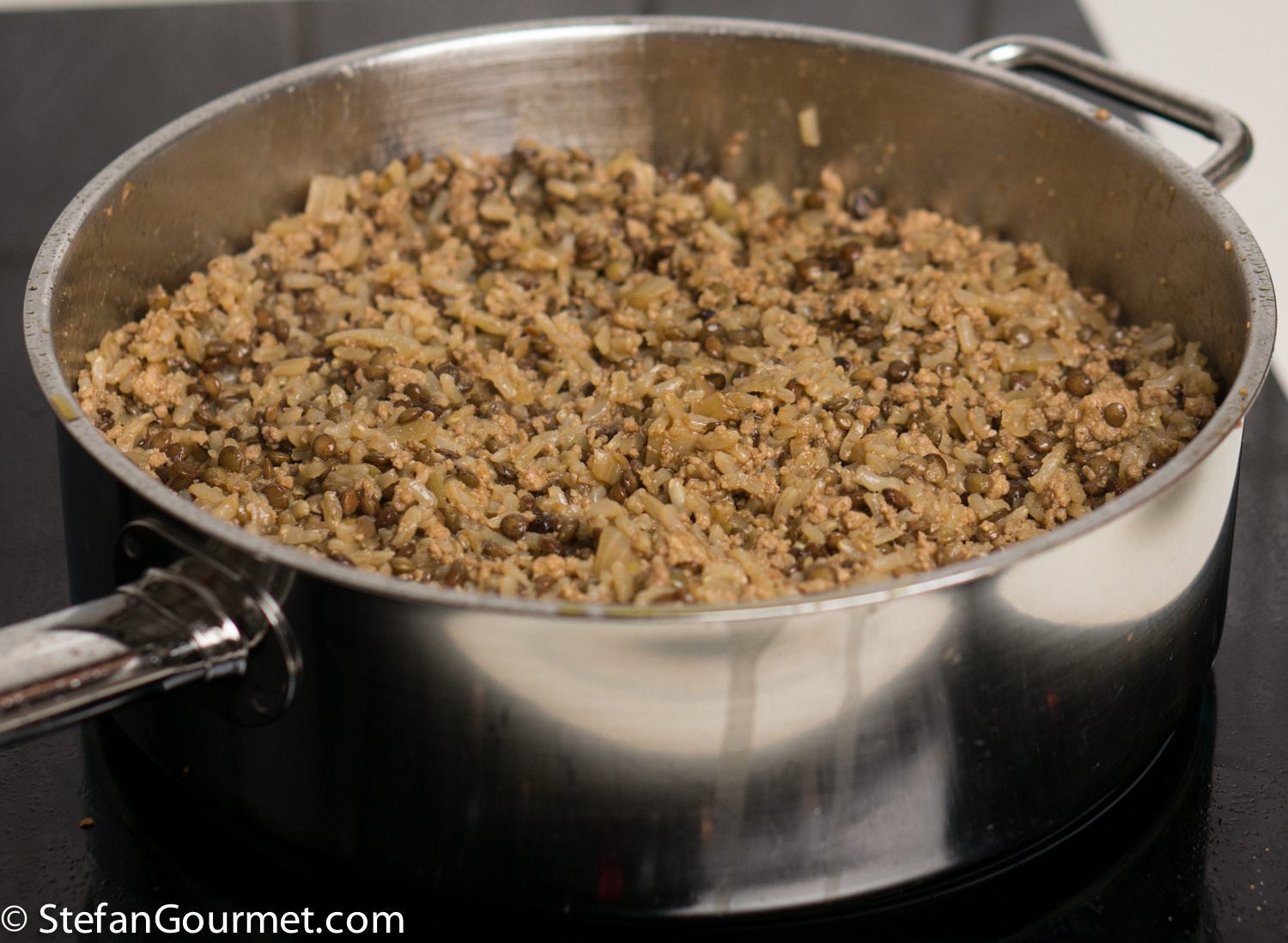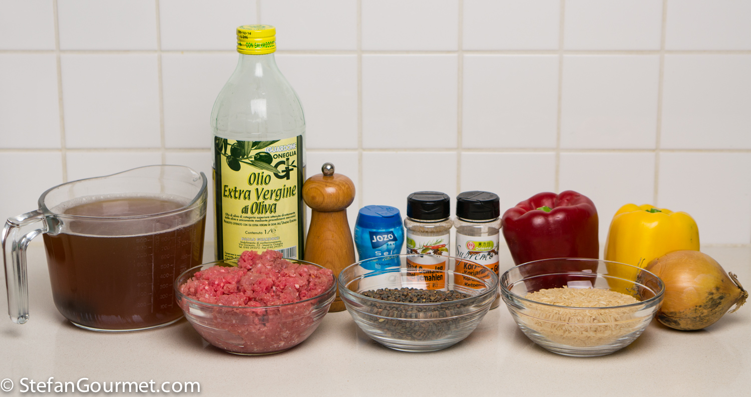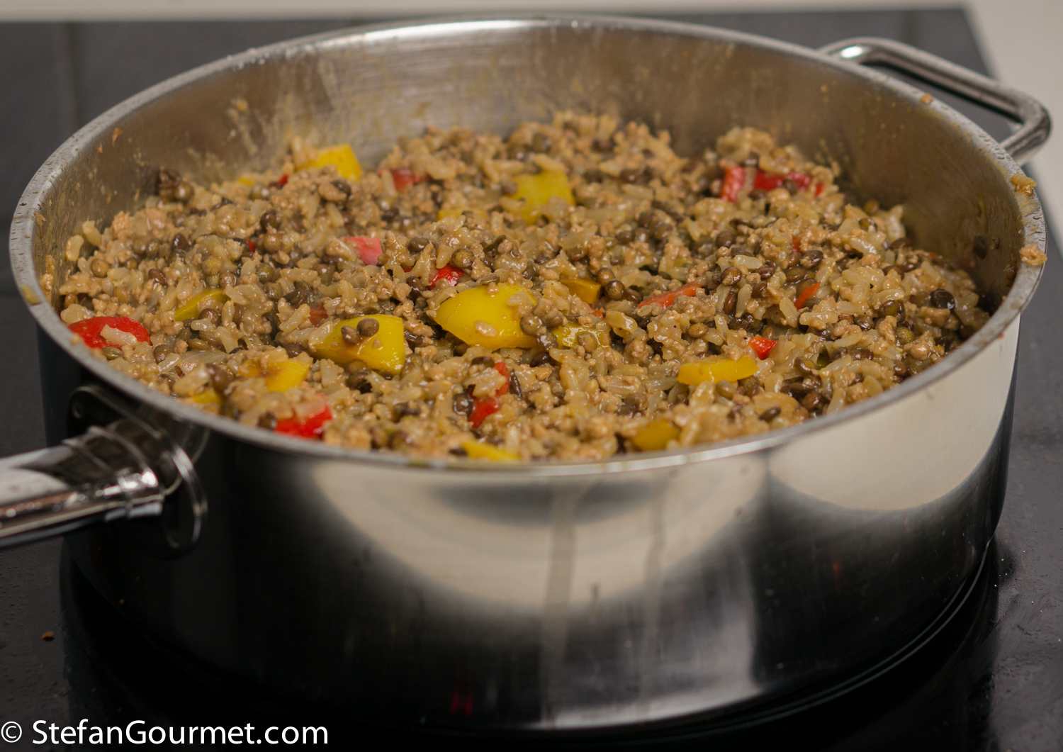 I created this dish because I wanted to make something that was both very nutritious and also tasty. I don’t believe in ‘super foods’ (which is mostly a way to make you pay more for foods that aren’t necessarily more nutritious), but I do believe in eating foods that are nutritious because they are high in protein and fiber. Lentils are high in both of them, and so is brown rice. Brown rice (or “hulled” or “unmilled” rice) is whole grain rice. It is chewier and more nutritious than white rice because it has the bran and germ, which are removed to make white rice. Because of this, brown rice is higher in protein and fiber than white rice, and it has more flavor as well. Just brown rice and lentils by themselves wouldn’t make for a tasty dish though. So I decided to add yellow and red bell peppers to add some color, crunch, and freshness. And to add ground beef and beef stock to make it more hearty and add an additional layer of flavor. Pilaf is a generic name for a dish that consists of rice cooked in stock with other ingredients, so the name fits the bill. The result was tasty indeed. Here is what I did…