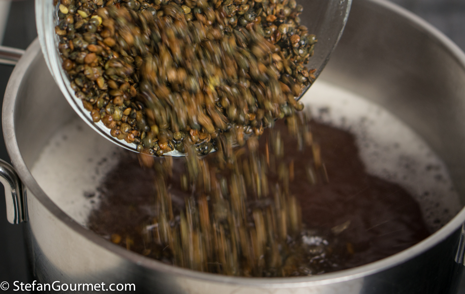 Bring 1 litre (4 cups) of beef stock to a boil. Add the lentils…