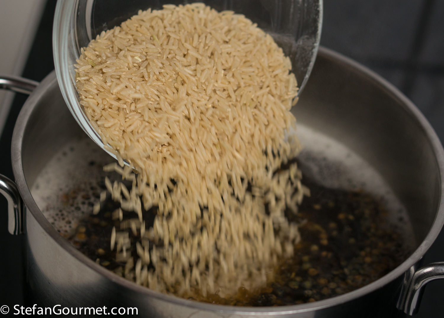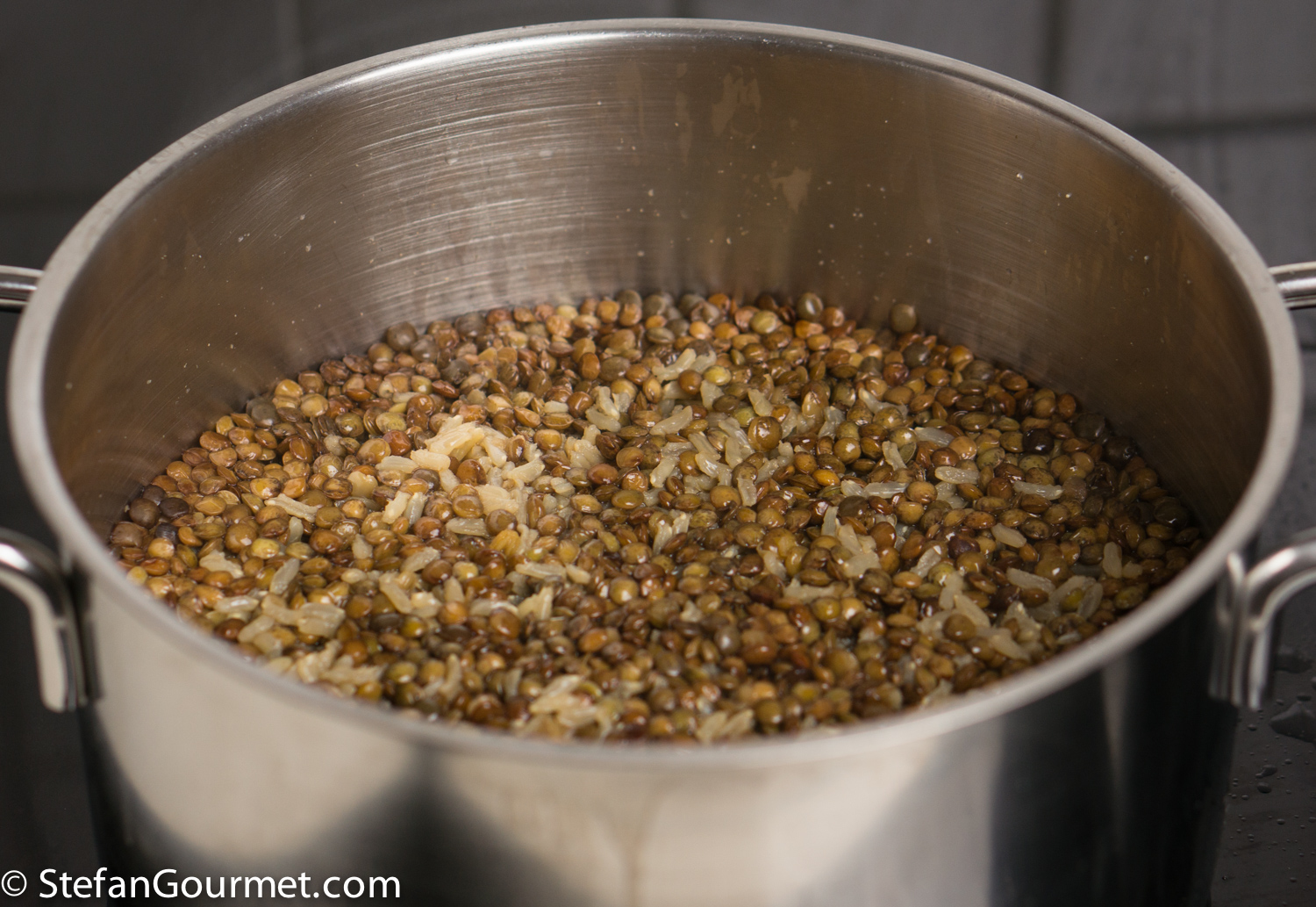 I used “du Puy” lentils, that do not require to be soaked and are done in 25 minutes. The brown rice I used also requires 25 minutes of cooking time. Adjust the cooking times as needed.
