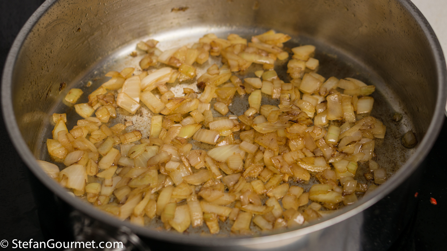 In the same pan, stir a chopped onion over medium heat until it is soft, about 5 minutes. You may need to add some additional olive oil.