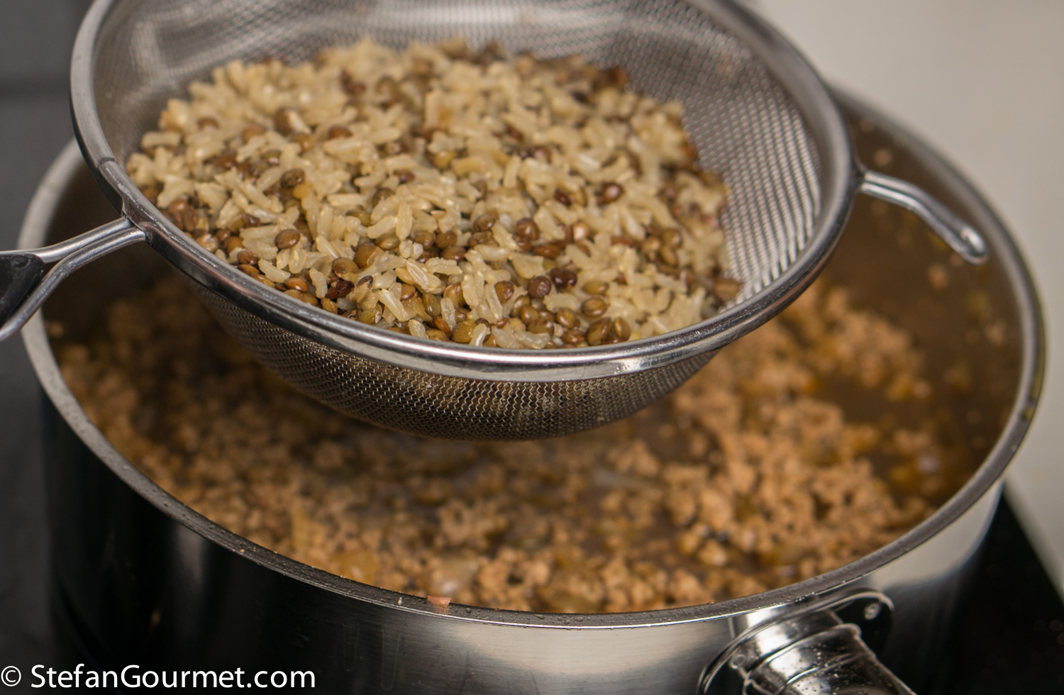 Strain the remaining beef stock from the rice and lentils into the pan with the meat (and reserve the rice and lentils for now).