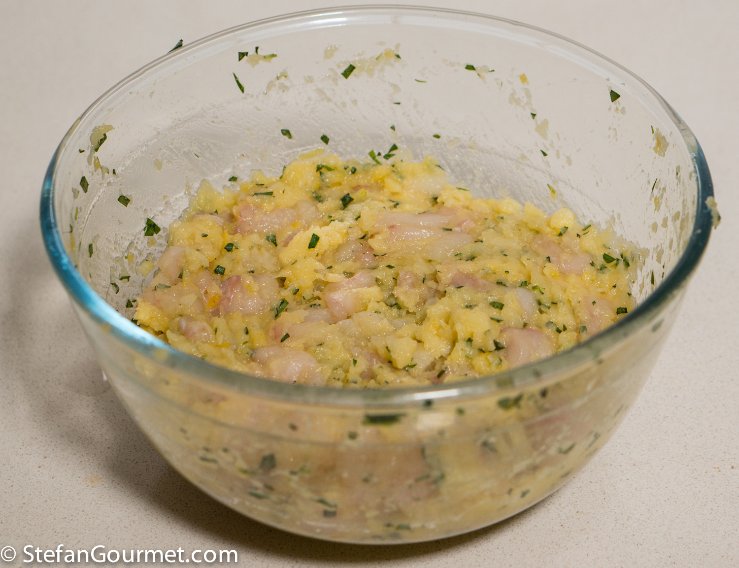 When the parsnip puree has cooled off, cut 300 grams of fish fillet into small pieces.