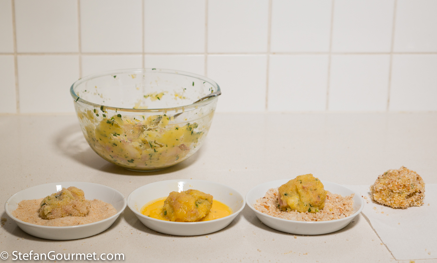 When the mixture has firmed up, set up an assembly line. First take a handful of the fish and parsnip mixture, and shape it into a ball. Then roll it in fine breadcrumbs (or flour). Next dip it into beaten egg (for this you will need 2 or 3 beaten eggs). Finally, roll it in coarse breadcrumbs (or panko). Allow the breaded fish balls to dry on kitchen paper while you finish making the other balls.