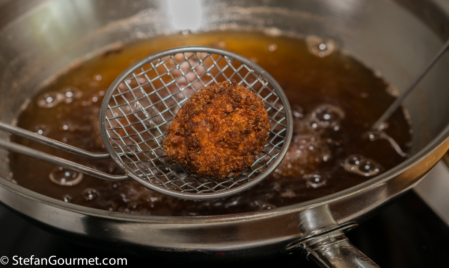 Deep fry the balls until they are golden brown and cooked through, about 4 minutes.