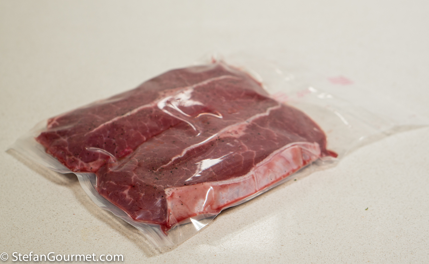 Blade steak or flat iron steak is a relatively inexpensive cut of beef that when you cook it sous-vide becomes more flavorful than many more expensive cuts of steak, and just as tender. Look for steaks with a lot of marbling in them, because that is what gives them the flavor. In the Netherlands this cut is called sukadelappen, and it is cut across the sinew that runs down the middle. The upside of this is that it is about half the price of rump steak and that slicing it across the grain makes it more tender, but the downside is that, depending on how tough the sinew is, you have to remove the sinew out of the steak if you want to serve it medium rare (when braised, the sinew becomes tender).