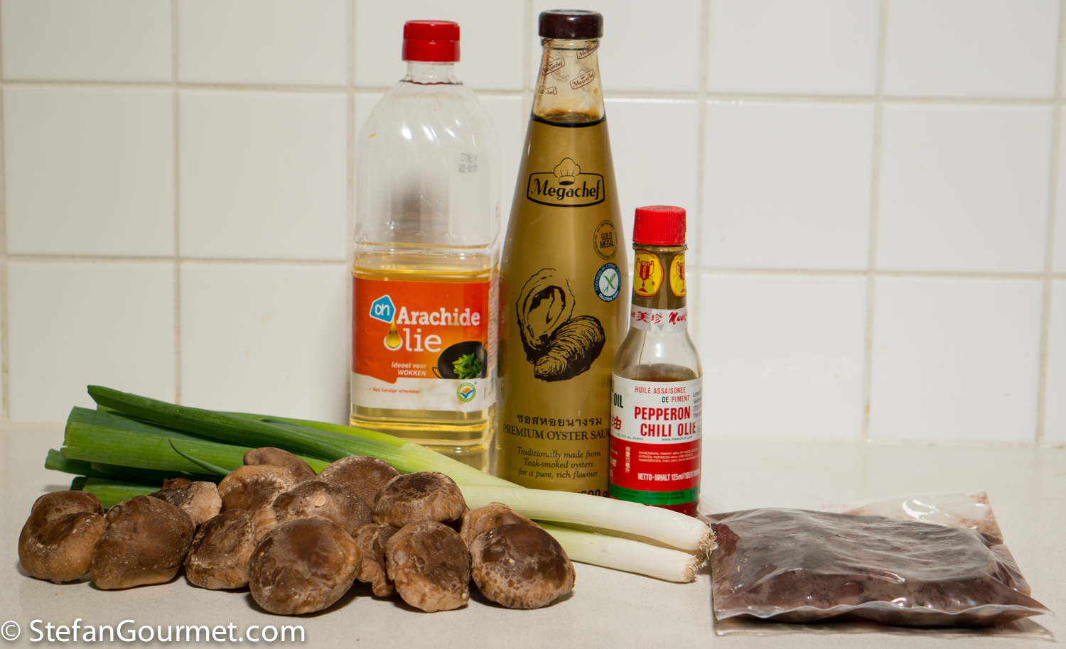 It is also very quick to make, provided that you put the steaks into the sous-vide water bath in the morning (before you leave for work), so all you have to do when you get home is to cook some rice, to chop and stir-fry the mushrooms and green onions, slice the steak, and mix everything. You will get a load of flavor for very little trouble. Of course it helps to invest in good quality oyster sauce, which should not contain MSG and have a high percentage of actual oysters (the one I used has 45%). Perhaps I will try and make my own oyster sauce from scratch one day from fresh oysters. But for now, let’s focus on this tasty recipe. Here’s what I did…