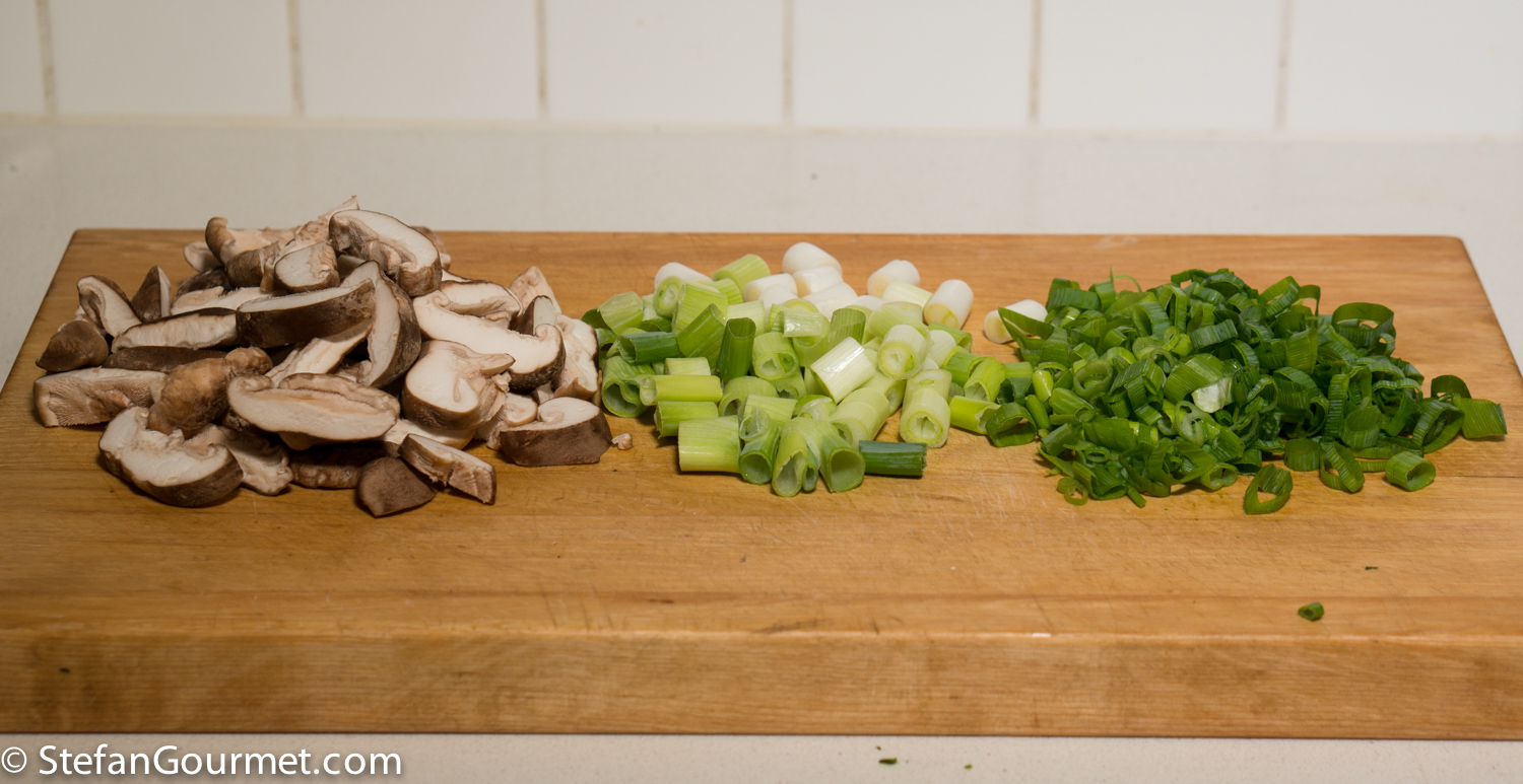 Slice 250 grams shii take mushrooms and 3 green onions, separating the white and light green part from the dark green ‘thin’ part of the green onions.