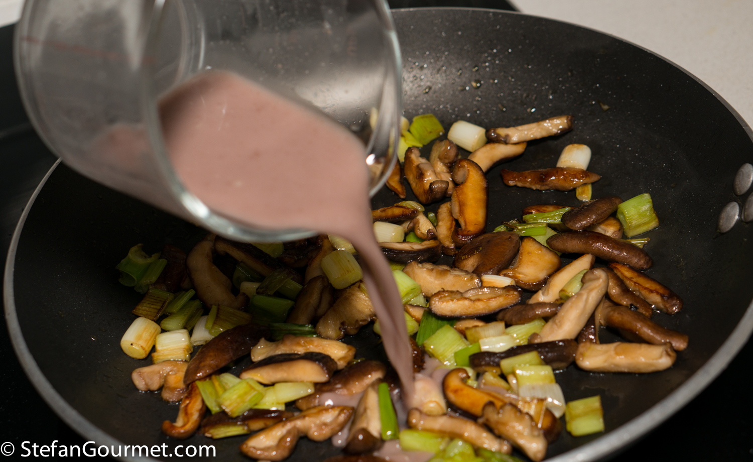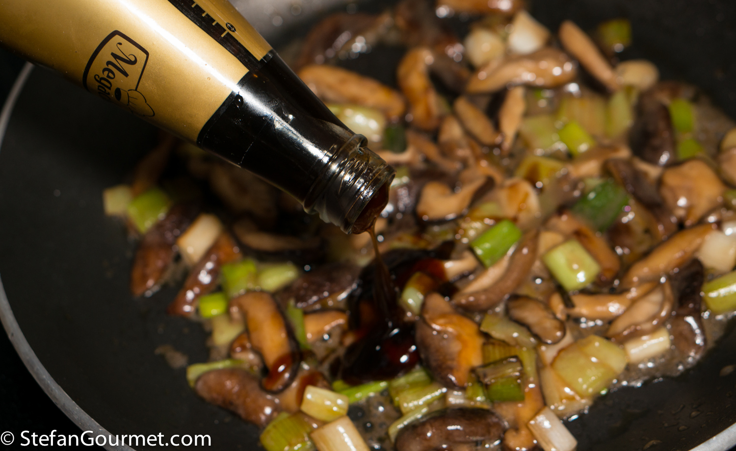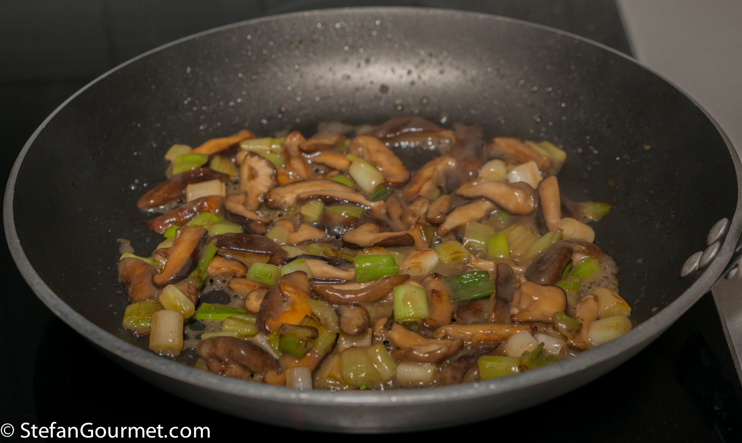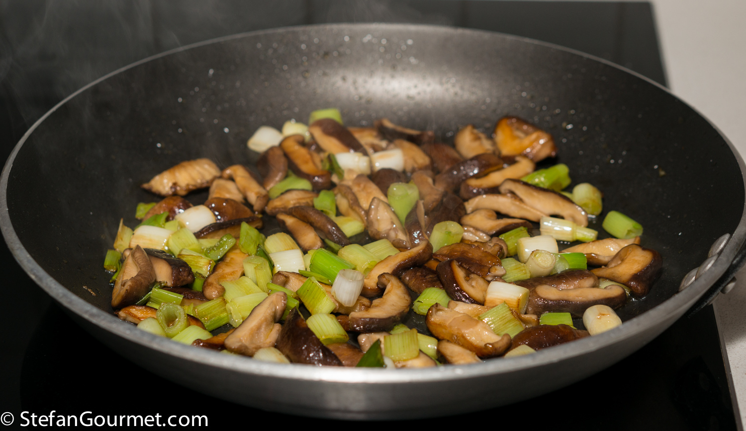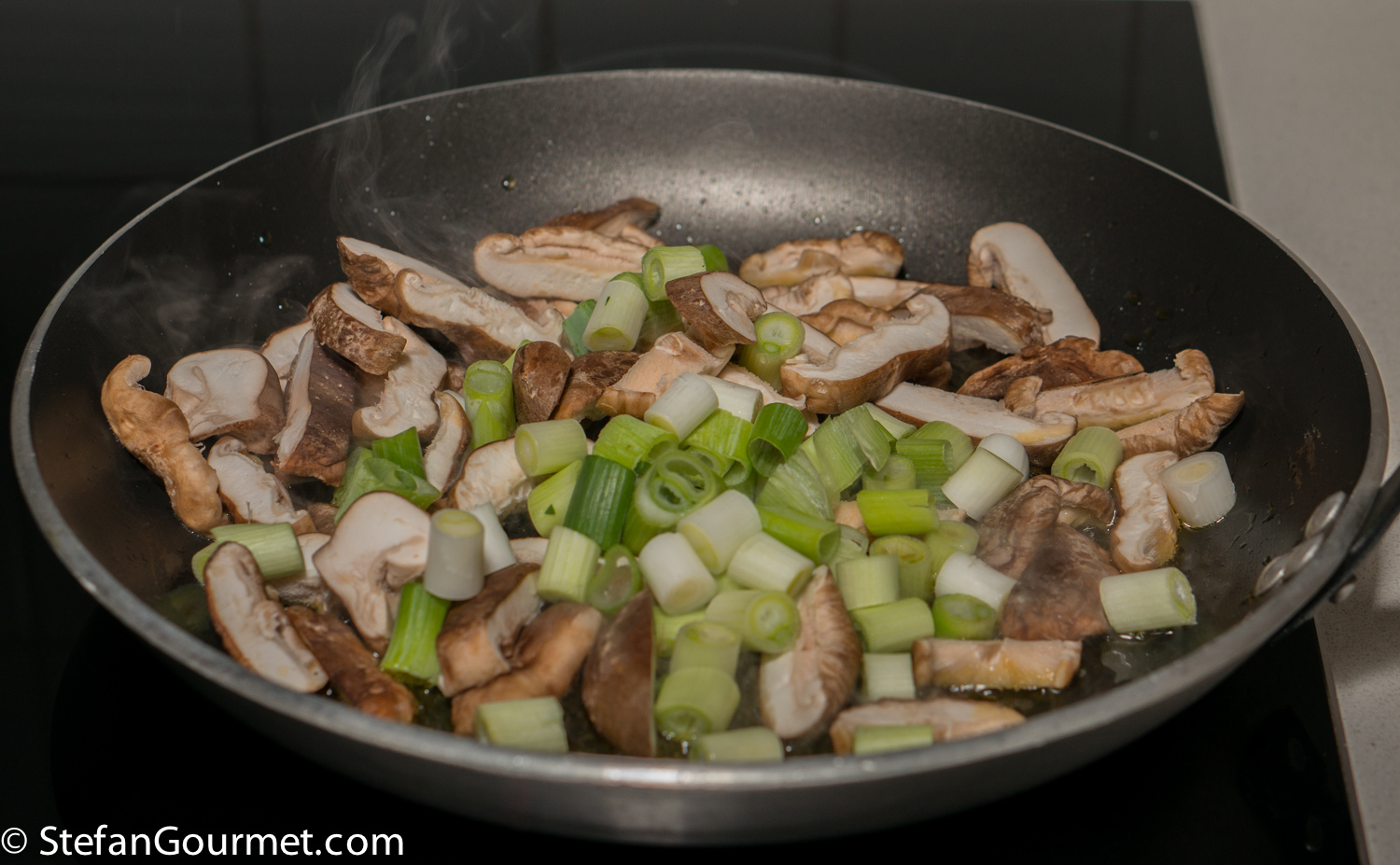 Heat 2 Tbsp vegetable oil in a wok or a non-stick frying pan. Stir-fry the shii take and the white and light green part of the green onions…