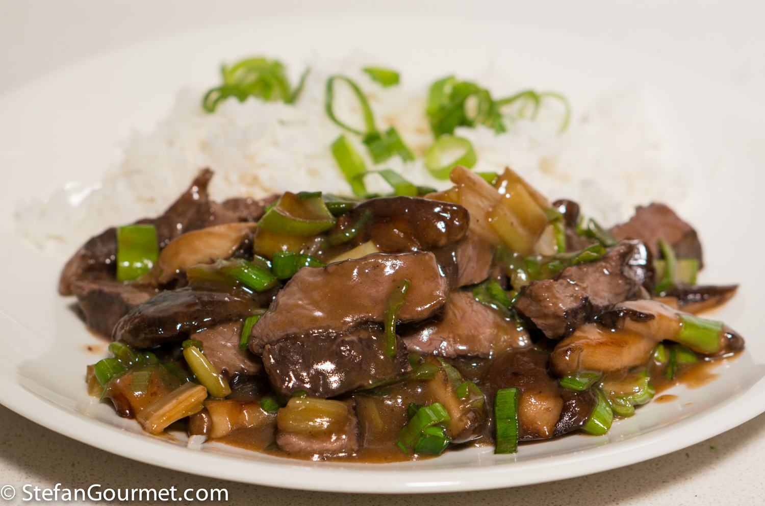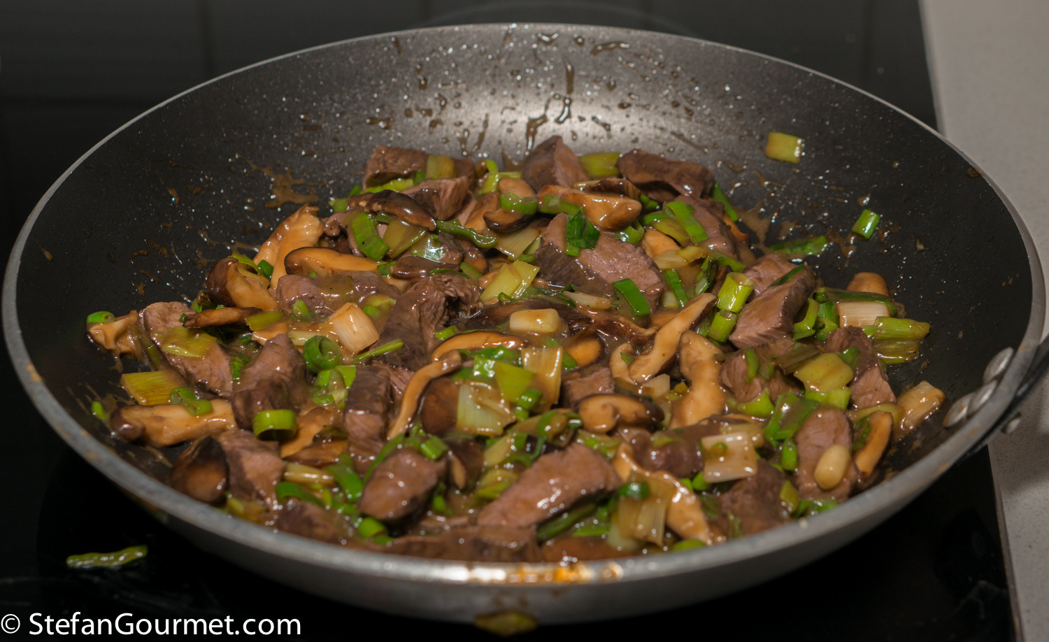 This post is about a slightly different take on a dish that is served in Chinese restaurants all over the world: strips of stir-fried beef with shii take mushrooms and oyster sauce. This version is delicious because: