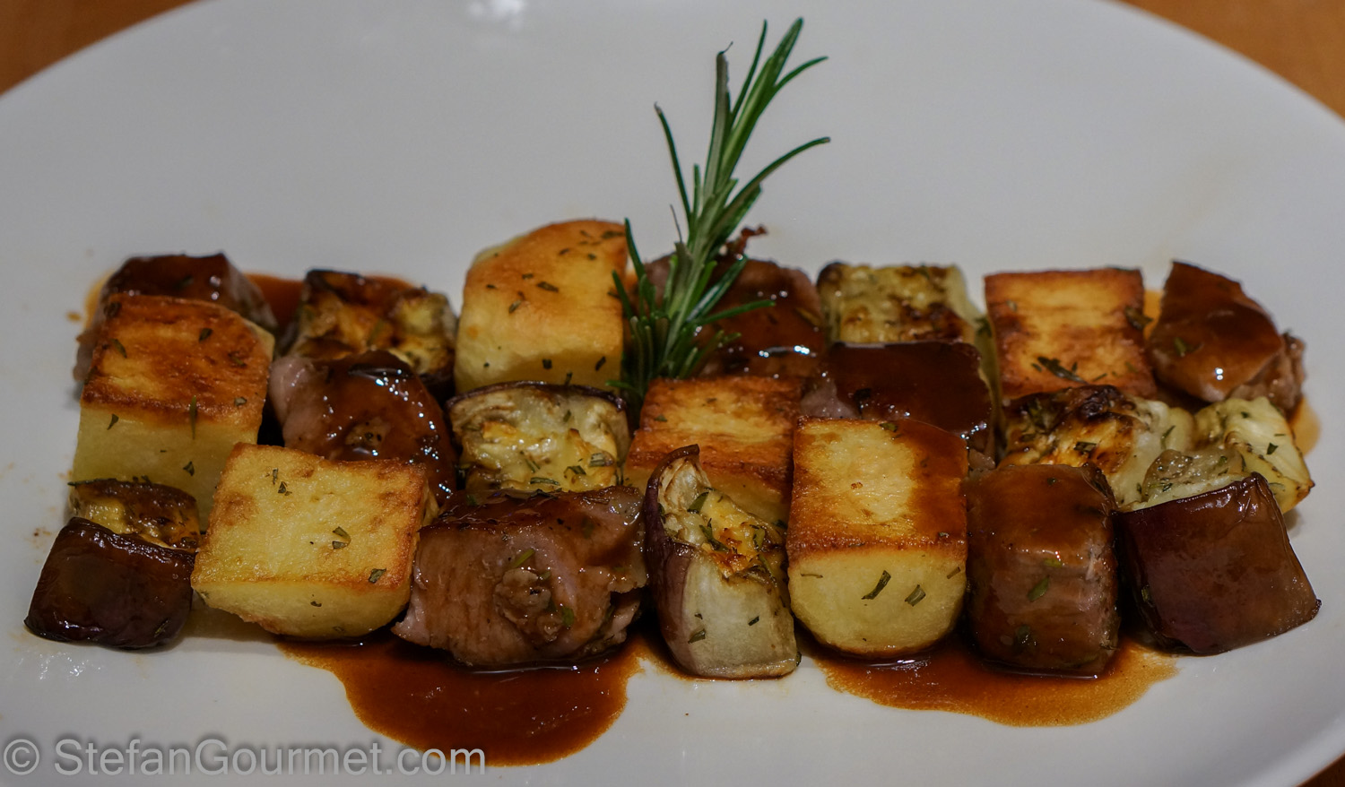 Usually I am a substance over form kind of guy, but this time around I went for the look — without forgetting about flavor of course! The flavors in this lamb, eggplant, and potato mosaic are a classic combination. I decided to cut all ingredients into cubes of roughly equal size, and serve the dish as a mosaic. I don’t like wasting food so the cubes are not as perfect as they would be in a Michelin starred restaurant. This is a nice dish to impress your friends as the ‘wow factor’ is in the presentation and the preparation is otherwise pretty straightforward.