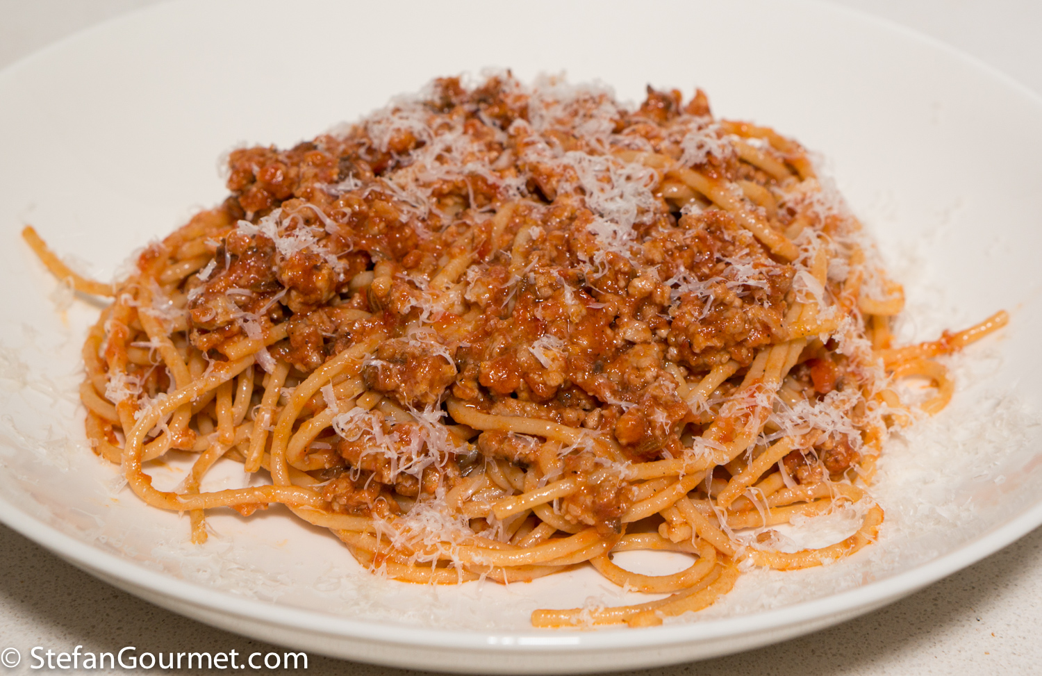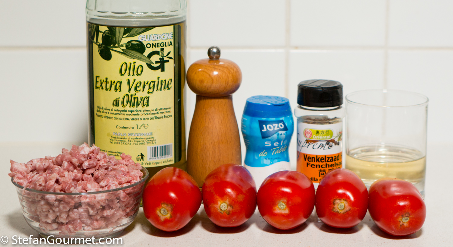 This summertime ragù is more elegant than ragù alla Bolognese and takes less time. It is best over fresh pasta, but as seen in the photo it is great on spaghetti or other store-bought dry pasta, too. As with many Italian recipes, the key is to use only a few ingredients of high quality. In this case ground pork, fresh ripe plum tomatoes, fennel seeds, and white wine (plus olive oil, salt and pepper). You may feel the urge to add onion, carrot, celery, garlic, basil, parsley, mushrooms, chillies, or what have you, but do yourself a favor and try the basic version. It will be less work and the flavor will be more elegant and pure. You will be able to taste the pork, tomatoes, and fennel seed individually as well as in combination. In this dish it is important to use fresh tomatoes, as canned tomatoes would overpower the delicate flavor of the pork.