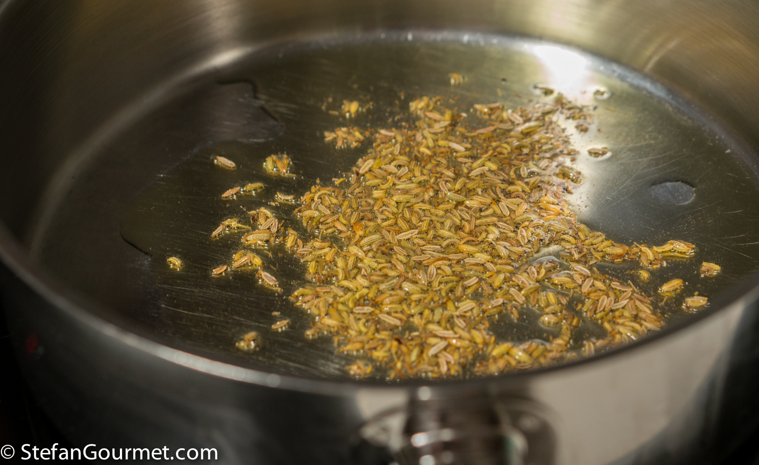 In a frying pan, heat 2 Tbsp of olive oil and add 2 teaspoons of fennel seeds. Toast them for a minute over medium heat.