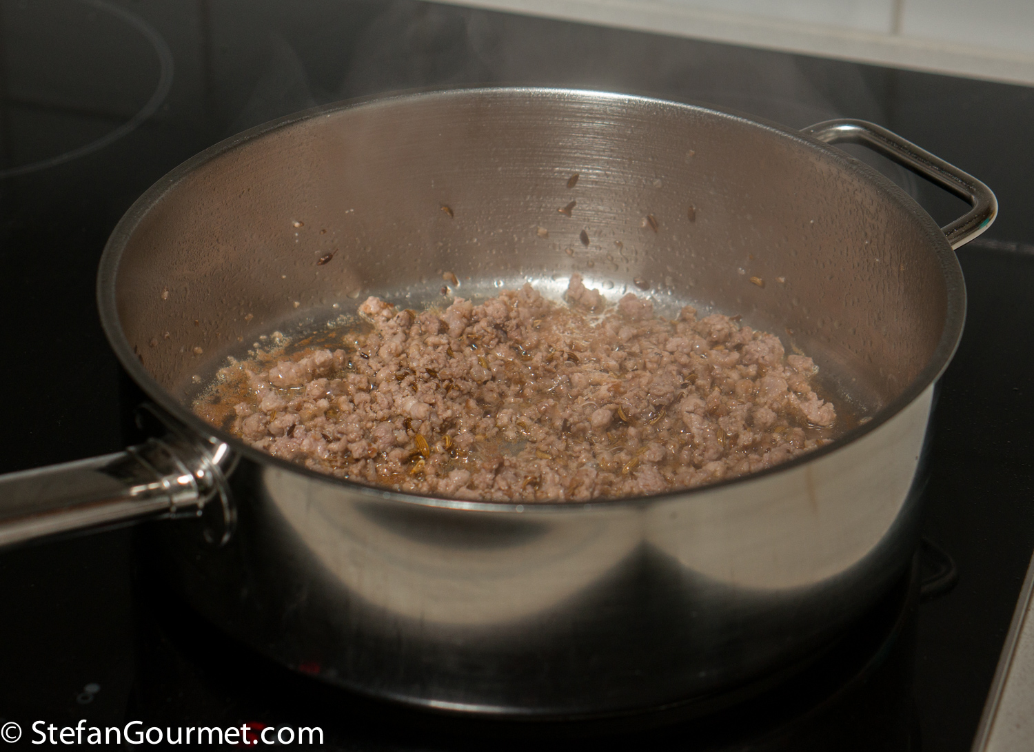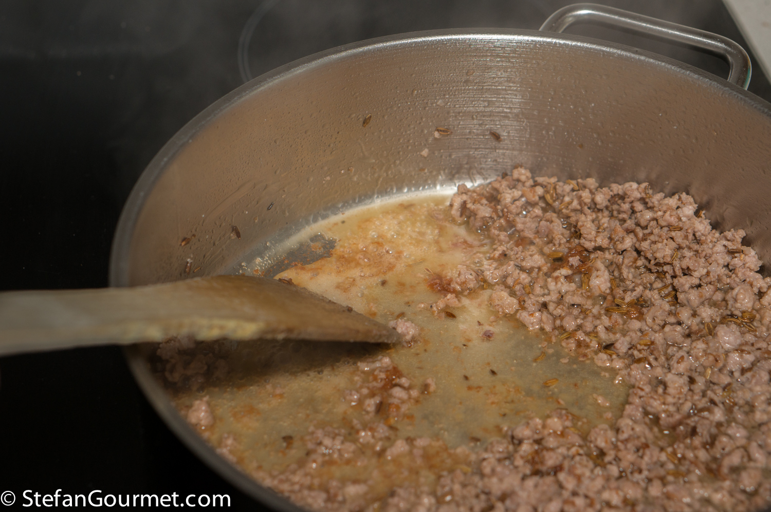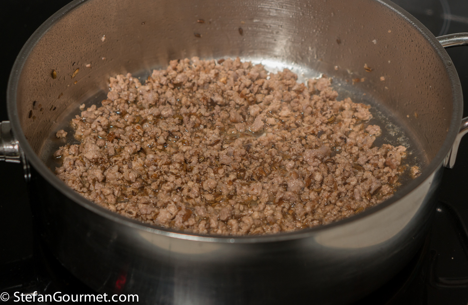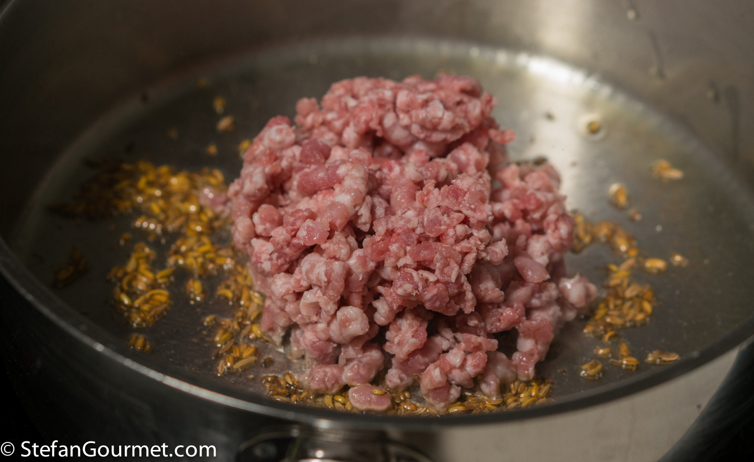 When the fennel seeds start to color, add 225 grams of ground pork. I used trimmings of a pork belly that I was turning into homemade pancetta that I ground in my meat grinder.