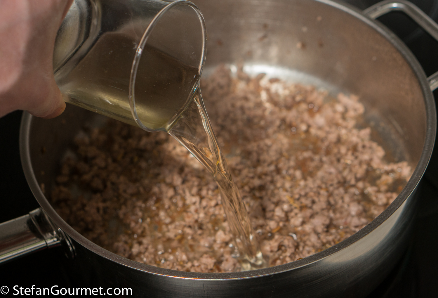 Use a wooden spatula to scrape any browned bits off the bottom of the pan to include them in the sauce. Reduce the heat to low to allow the wine to evaporate.