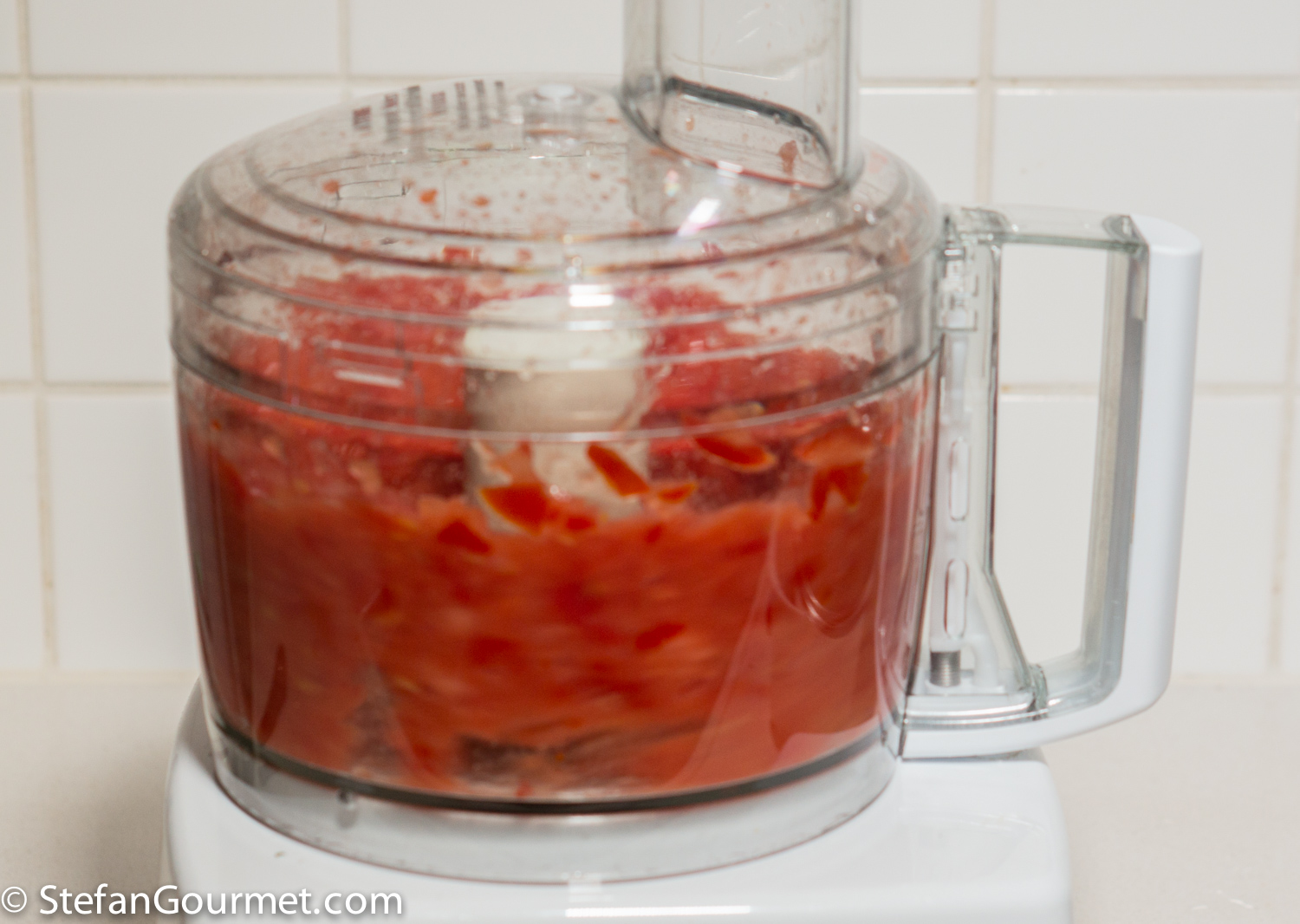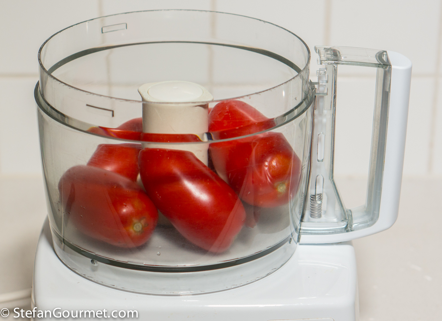 In the meantime, put 500 grams of plum tomatoes in the food processor…