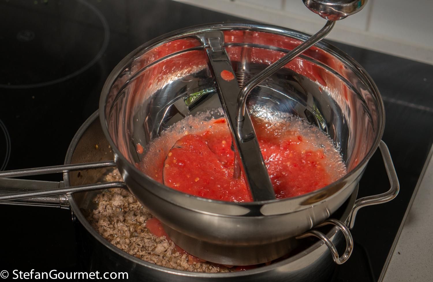 …use a food mill to sieve the pureed tomato pulp directly into the frying pan. The food mill will remove the seeds and pieces of skin from the tomato pulp. Season with salt and freshly ground black pepper.