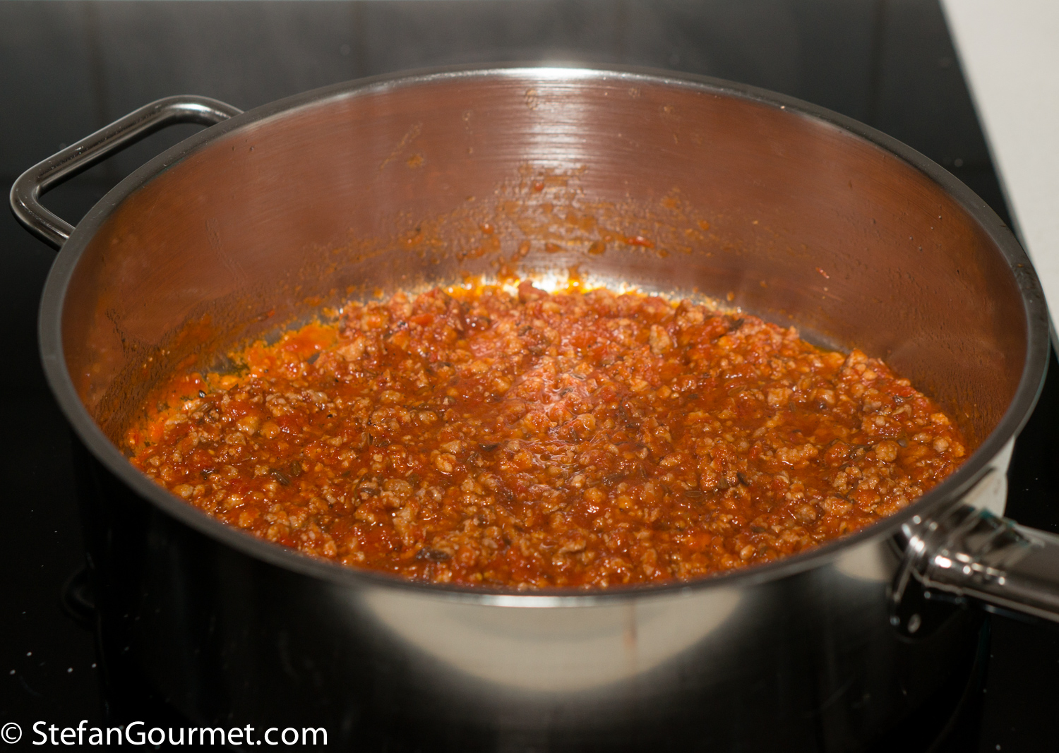 Cook over medium heat, breaking up the meat with a wooden spatula, until the pink color of the meat has disappeared.