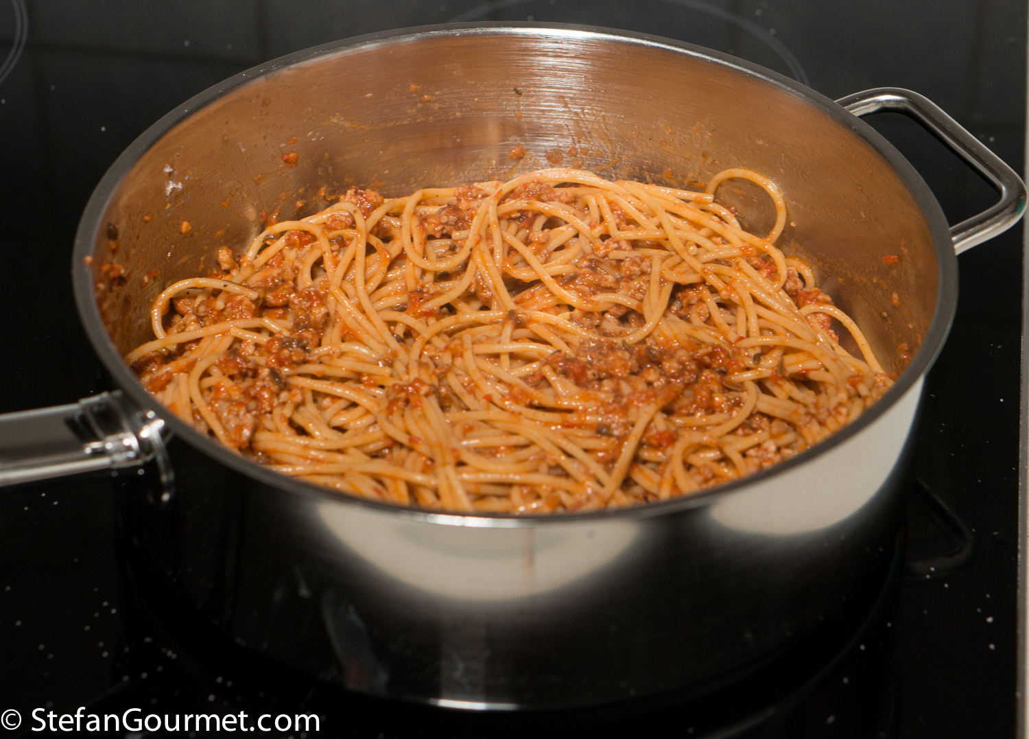 Meanwhile, cook the pasta. When the pasta is al dente, drain it, and add it to the ragù together with a generous handful of freshly grated parmigiano. (If the ragù was already quite dry, you may wish to reserve a few tablespoons of the pasta cooking water and use that to moisten the pasta with ragù.)