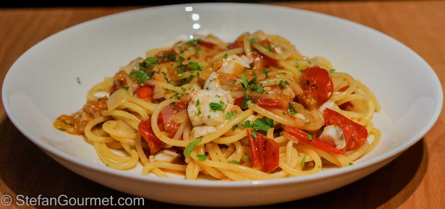 Acqua Pazza (which literally means “crazy water”) is a dish from Campania, the region of Naples. It can be either a primo piatto or a secondo piatto. As a secondo, it is fish cooked with cherry tomatoes. As a primo, it is pasta with fish and cherry tomatoes. I don’t have a clue why it is called crazy, but it sure is delicous.