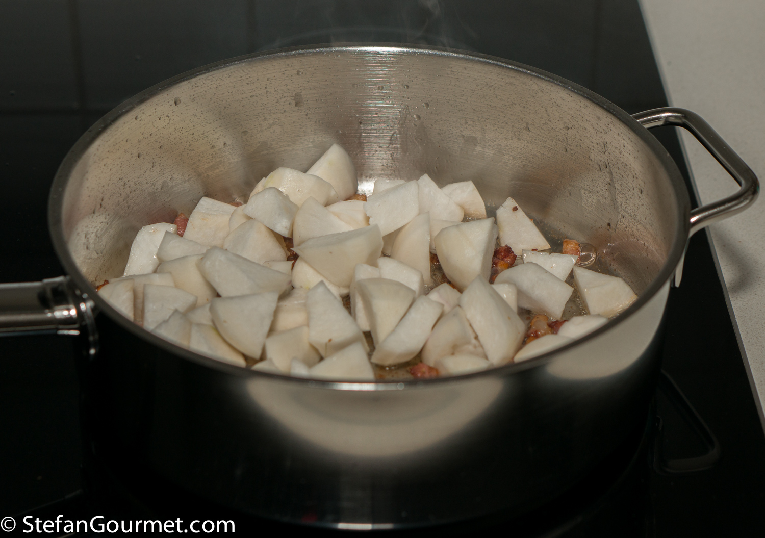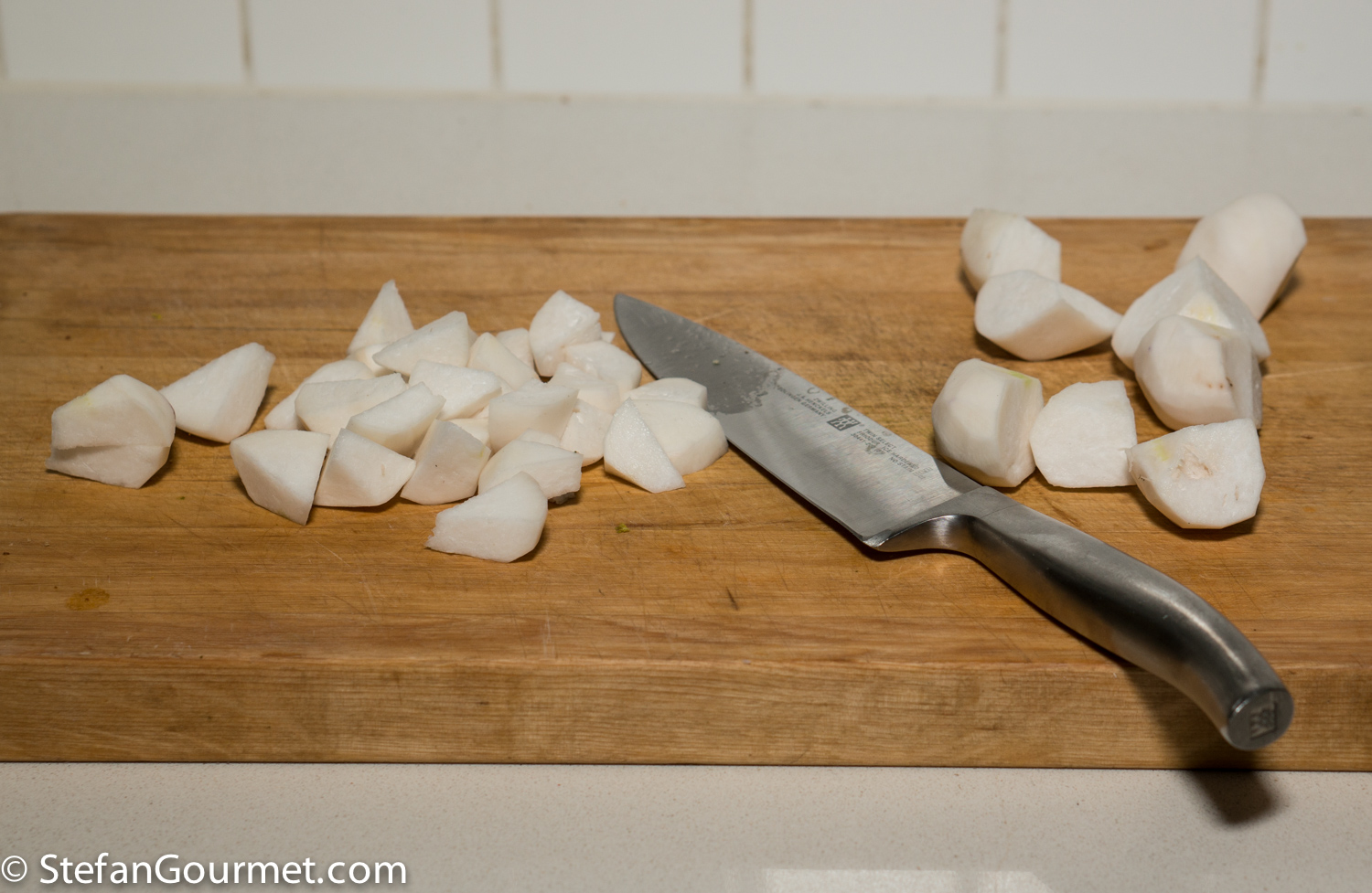 Meanwhile, peel the turnips, remove the stems, and cut them into smallish pieces.