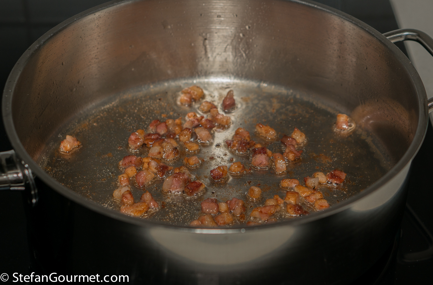 Heat a tablespoon of clarified butter (or olive oil) in a frying pan, and add 40 grams of diced pancetta. Cook over medium heat until the pancetta is golden and a lot of fat has rendered from it.