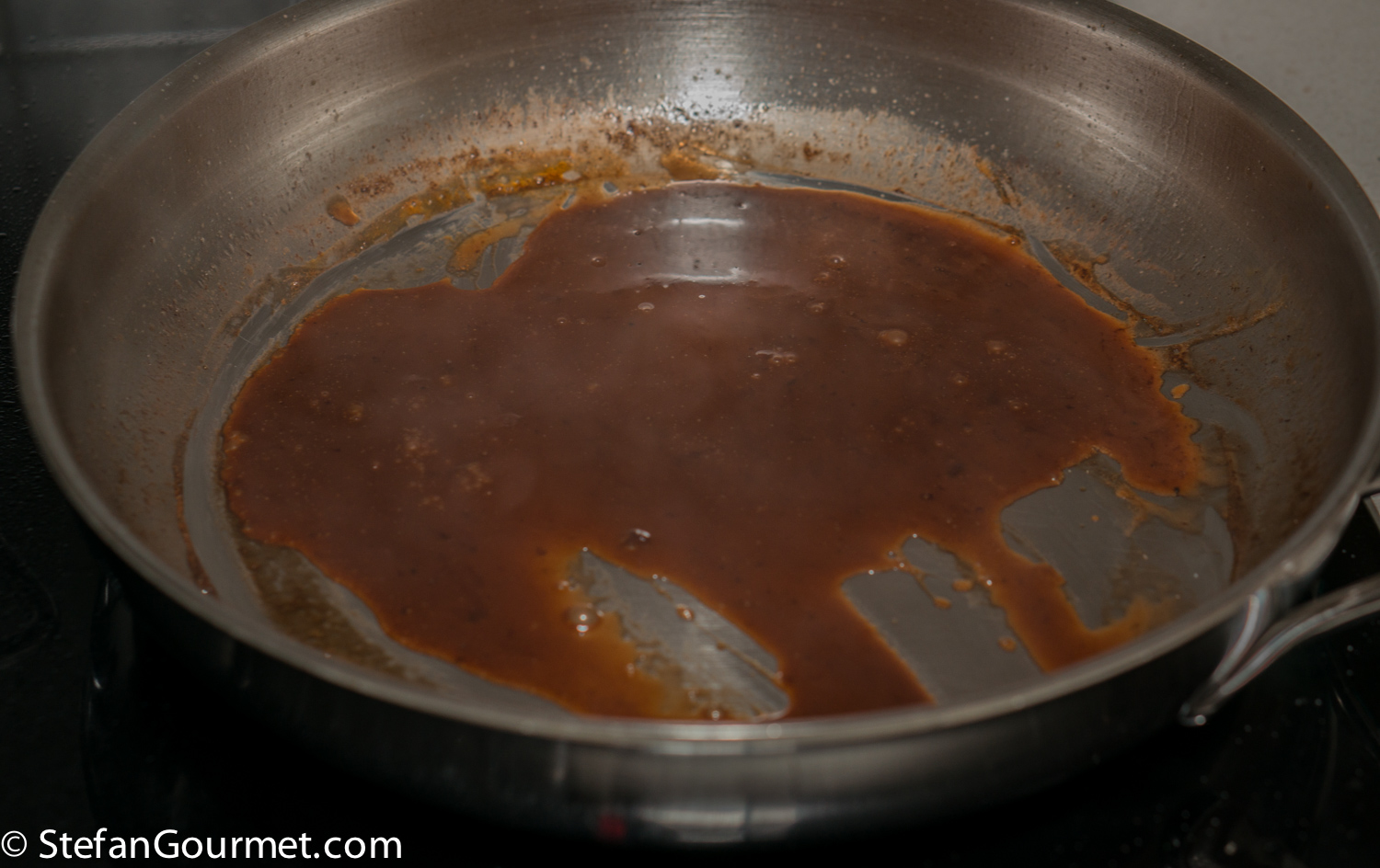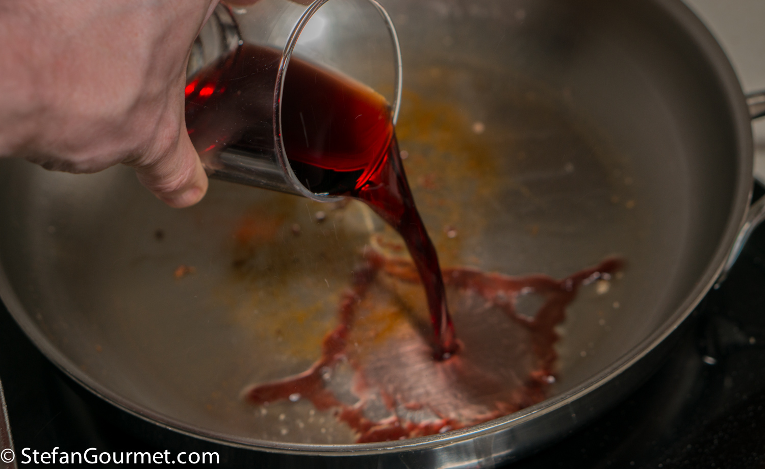 Discard most of the fat in the frying pan, then deglaze with 60 ml of red wine. Scrape with a wooden spatula to get any browned bits attached to the bottom of the pan into the sauce.